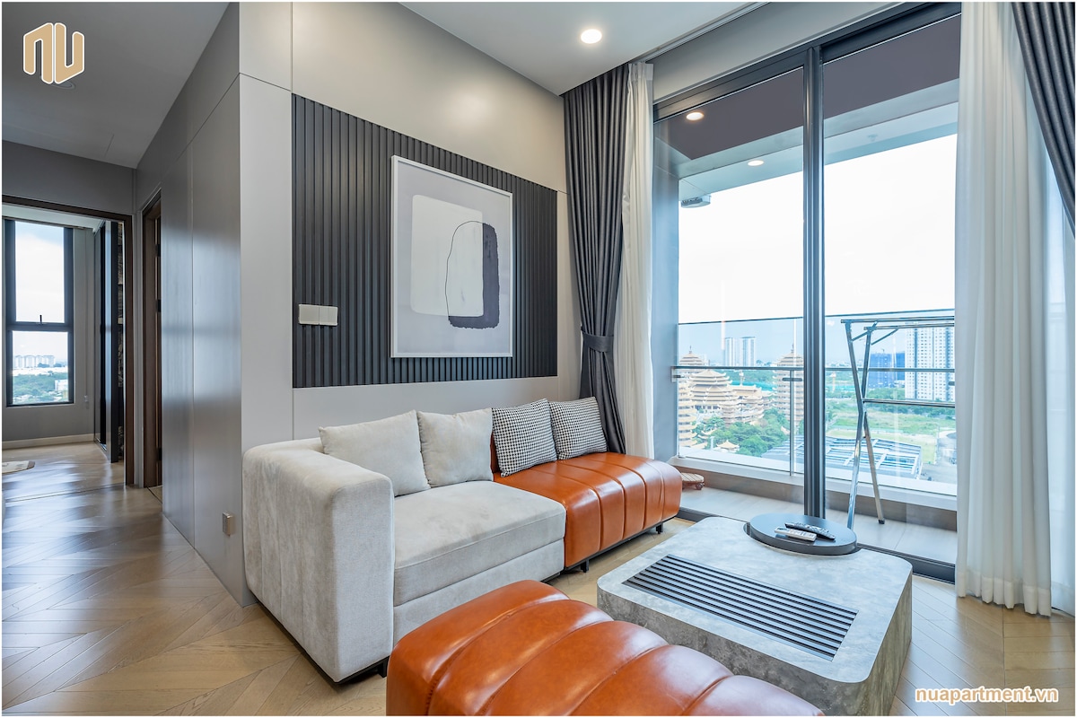 Experience NU Lumiere 2BR – a modern 2-bedroom apartment in An Phú, Thảo Điền. Each unit features a spacious balcony with river views, elegant interiors, and natural light. Guests enjoy access to one of Saigon’s most beautiful pools, a full gym, and 24/7 security. Just 15 minutes to downtown, with direct access to Metro Line 1 for easy citywide connections – ideal for business trips or relaxing stays