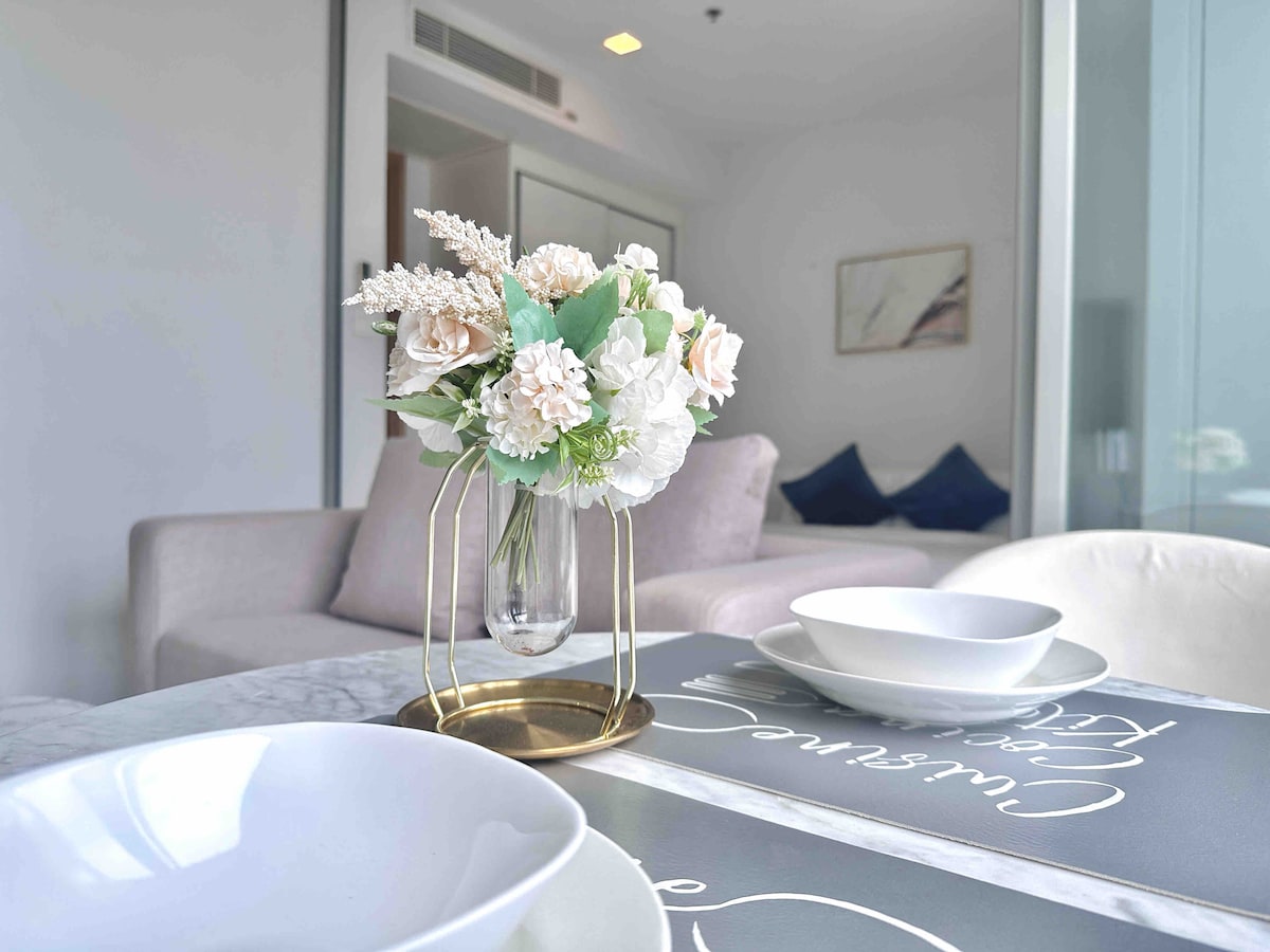 A spacious entire apartment with private bath, kitchenette, living/dining, 1 bedroom with designated working area, balcony and daybed. Enjoy the wide windows for uninterrupted views and plenty of sunlight, increasing airiness for a more relaxing stay. Enjoy all the conveniences of city-life, including: - 5 min to BTS Asok, MRT Sukhumvit - 5 min to Terminal 21, Emporium/Emquartier and Benjasiri Park - 1 min to 7-11 convenient store - Lots of street food, cafe and taxi/bikes