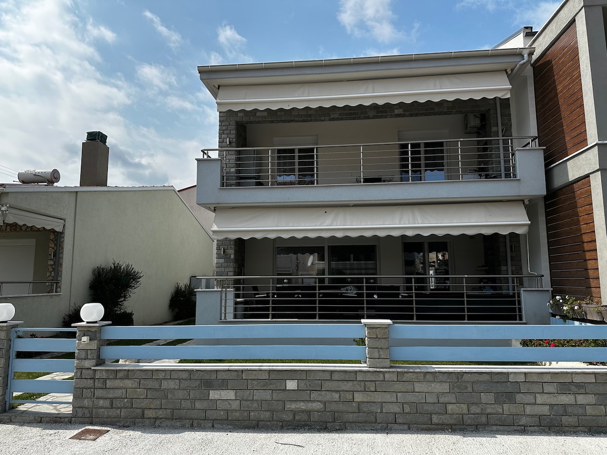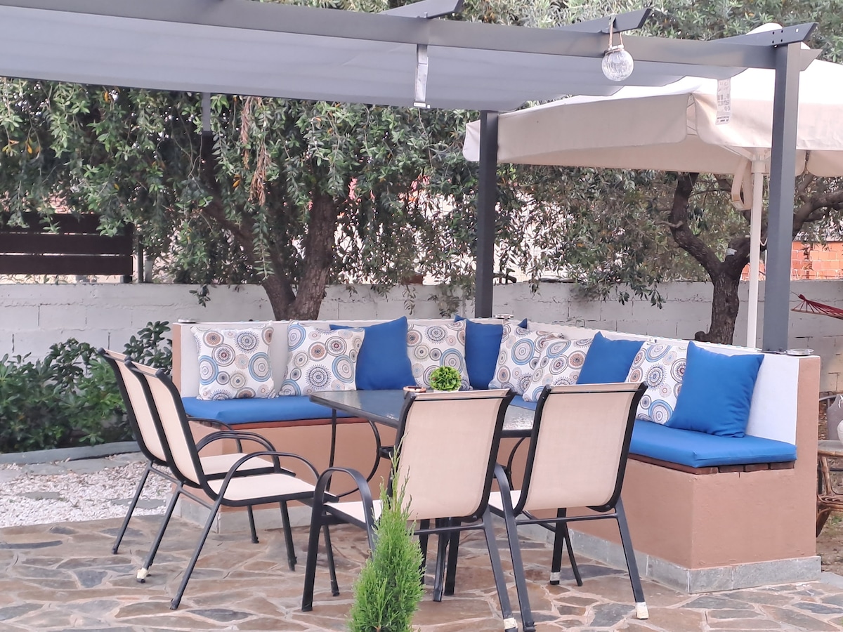 140m² villa surrounded by olive trees LIVING ROOM 25m² 3 BEDROOMS with air conditioning 10 beds, 6 double, 2 sofa bed, 2 single beds 3 cots/cribs, 3 BATHROOMS kitchen microwave and static oven, 2 large refrigerators with freezer 3 VERANDAS 3x6 PERGOLA 60m², equipped for breakfast lunch dinner, barbecue rotisserie oven, PLAY AREA 200m² COURTYARD 300m² Pets allowed. BEACH 300 meters from Skidia bay and 1200 meters from the beaches of Aliky and Thimonià.