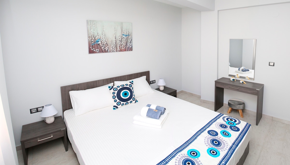 Our comfortable Superior Apartment (ca. 40m2) is located on the first floor of the property. It features an air-conditioned bedroom with 1 double bed and in the other room 2 single beds, a fully equipped kitchenette and a bathroom with shower. The apartment has also a large wardrobe, TV, air-condition, welcome tray with coffee, sugar, honey, olive oil etc, balcony, wi-fi, safe, hairdryer, slippers, beach towels and all the necessary bathroom and room amenities. Cleaning on a daily basis.