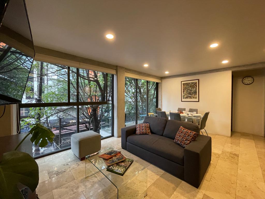 Departamento nuevo en tres niveles con espléndida vista a un bello jardín mexicano-andaluz. Dos amplías camas, dos baños completos, cocina equipada, comedor y una cómoda sala. Muy tranquilo y silencioso pues se encuentra protegido por cuatro frondosos arboles del jardín. El barrio de Santa María se ha posicionado en el gusto de la gente joven, hay una amplia gama gastronómica y es una colonia aledaña al Centro Histórico, a 10 minutos a pie del metro San Cosme, a 4 estaciones llega al Zócalo.