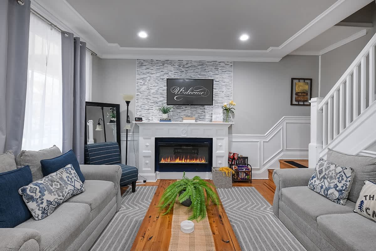- Sunlit family rm with electric built-in fireplace & smart TV - Dining for 6, smart TV, electric fireplace and Multi-lighting options for the mode - Fully-equipped kitchen, coffee bar, knee bar - 2nd Family Rm with Sleeper sofa, prvt bath, books, games, laundry - 2 upstairs bedrooms with ceiling fans, smart TVs - Common full bath with tub & shower - Prvt parking for 2 - Classic front porch seating - Central to plenty of restaurant options We're excited to host you. Book Now or Ask me anything