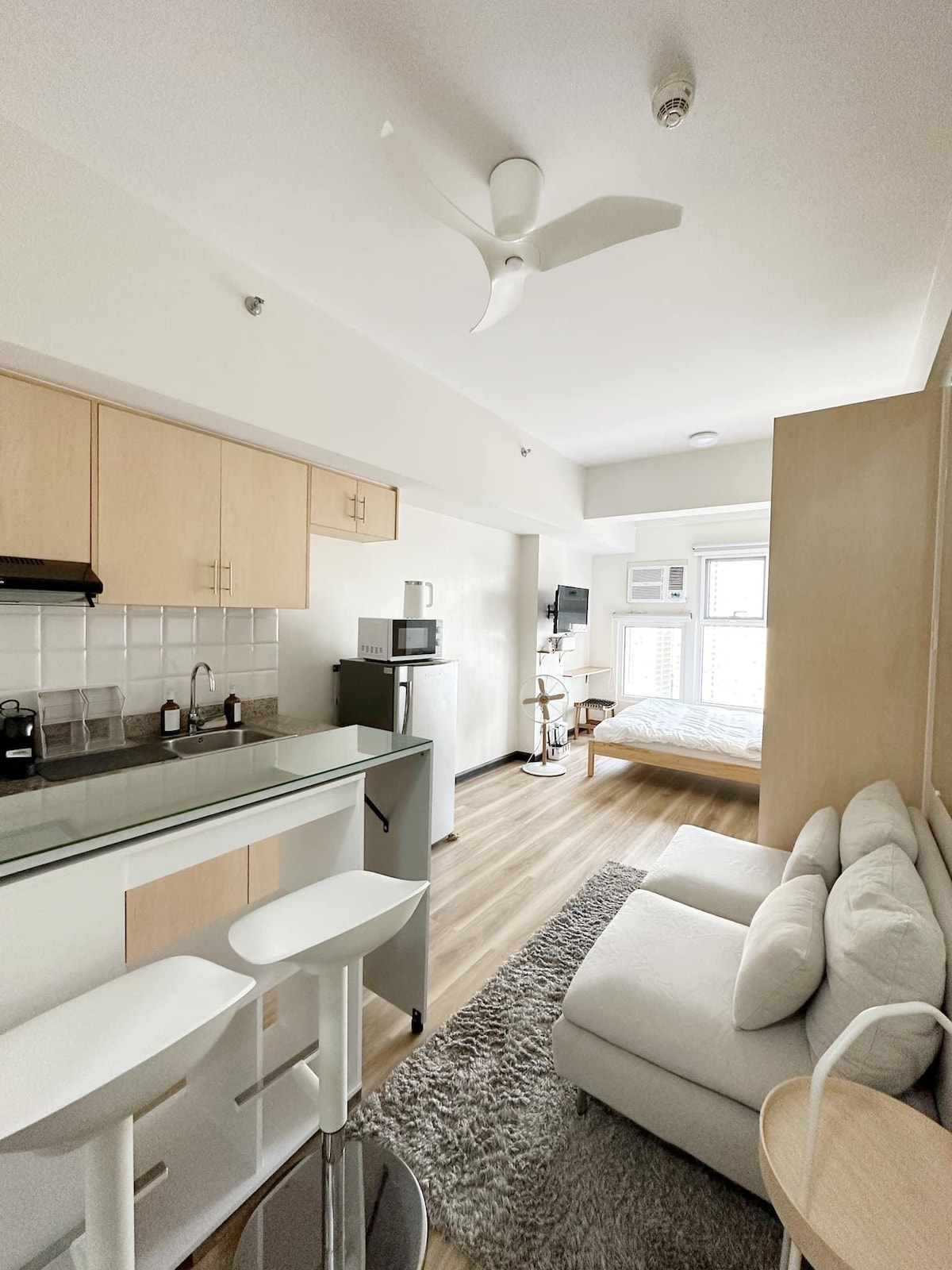 Hello, welcome to AirJapandiMakati your beautiful home away from home! Enjoy a stylish Japandi inspired 2BR fully furnished condo unit in the heart of Makati! This place is just over a year old and newly professionally redesigned for a perfect staycation & mini-getaway. It offers a beautiful view of the Makati Skyline right from your bedroom. This unit comes with fully furnished kitchenette, high-speed Wifi, 43-inch Smart TV with Netflix, a private bathroom with hot shower heater & bidet.