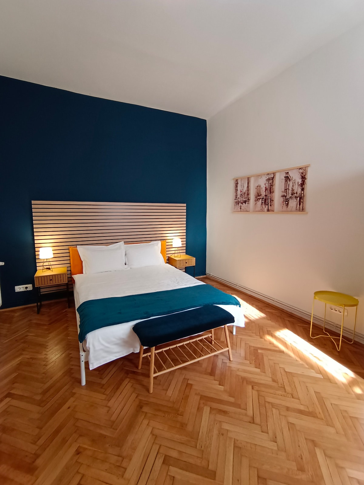 Feel the Old World elegance in rooms with high ceilings, parquet floors, and period architectural features. Black accent walls and abstract art add a modern touch while other details evoke Art Deco. Step onto a narrow balcony for some fresh air. The apartment is a minute's walk from the famous Piata Sfatului and the Old City center. Walk a little farther to see the Gothic architecture of the Black Church