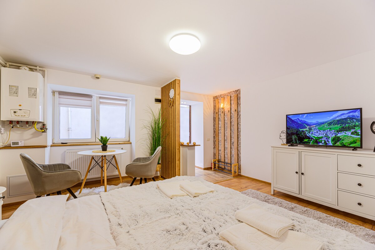 Cozy and spacious studio in the heart of historic Brasov Enjoy your stay in this cozy, large studio apartment located in a charming historic building right in the center of Brasov. The bright and airy living space features a comfortable queen bed, a bathroom, and a fully equipped kitchen — perfect for a relaxing and convenient stay. Just a few minutes’ walk from the city’s main tourist attractions, with easy access to the best restaurants, shops, and nightlife Brasov has to offer.
