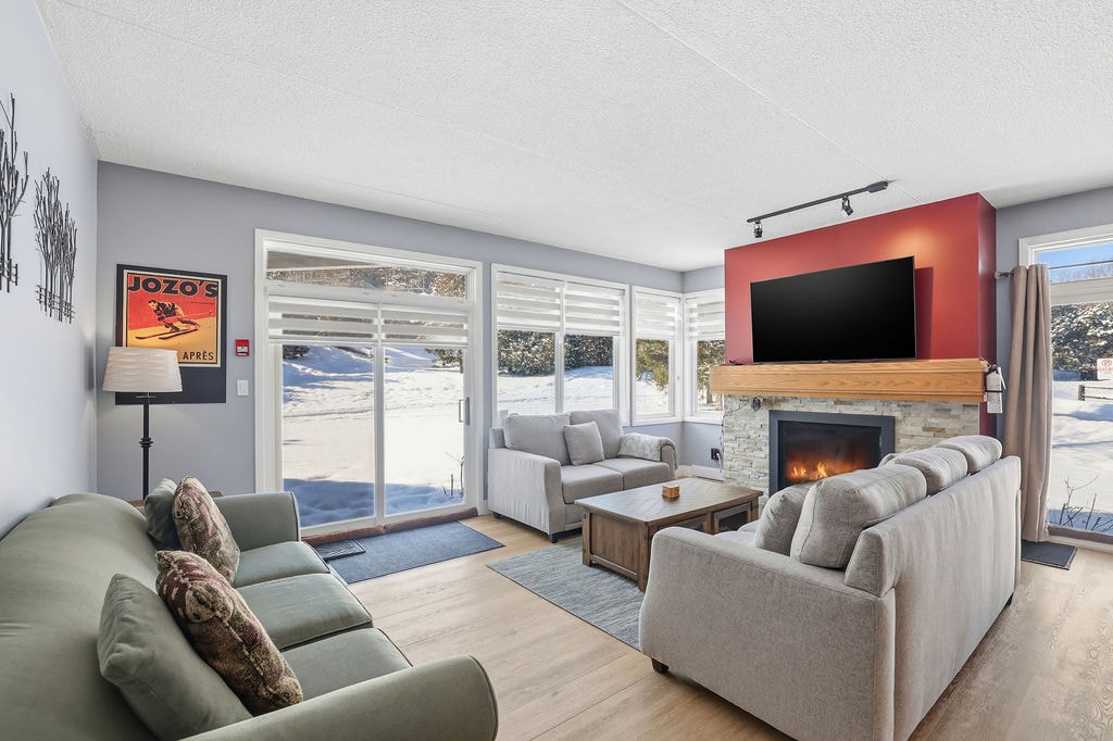 SKI IN AND SKI OUT from the back deck (snow dependent)!! Notice the amount of comfortable seating for NINE PEOPLE around the TV that many other places are without. At the end of a long ski day having a comfortable place for everyone to sit is what most Chalets are missing. Enjoy our family’s beautiful renovated GROUND FLOOR chalet with 2 Bedrooms, 2 Baths, 6 Beds conveniently located next to the Blue Mountain Inn. Blue Mountain Village is a 7 minute walk away. Location, Location, Location