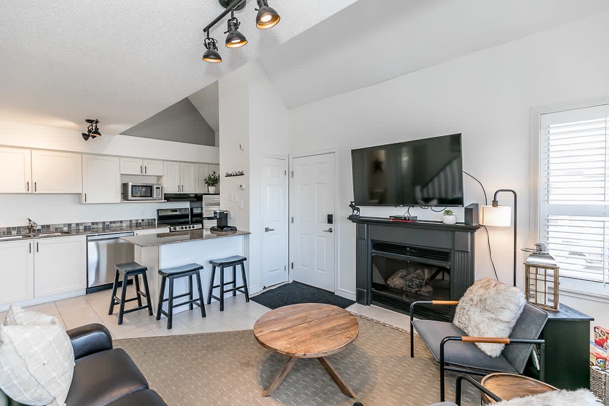 Discover the perfect mountain escape in this updated ski-in/ski-out studio, located beside the North Chair Lift. Ideal for couples or small families, it offers a custom kitchen, cozy fireplace, modern finishes, and warm chalet charm. Only 1 km to Blue Mountain Village, Scandinavian Spa, beaches, trails, and great dining, this stylish retreat delivers comfort, convenience, and unbeatable year-round adventure right at your door. Relax, recharge, and enjoy every moment in this inviting hideaway.