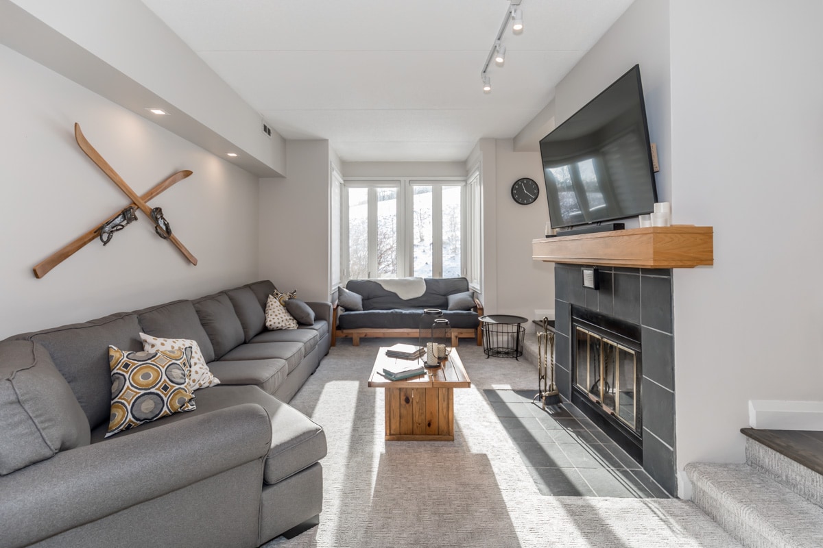 SKI IN AND SKI OUT from the back deck (snow dependent)!! Notice the amount of comfortable seating for NINE PEOPLE around the TV that many other places are without. At the end of a long ski day having a comfortable place for everyone to sit is what most Chalets are missing. Enjoy our family’s beautiful renovated GROUND FLOOR chalet with 2 Bedrooms, 2 Baths, 6 Beds conveniently located next to the Blue Mountain Inn. Blue Mountain Village is a 7 minute walk away. Location, Location, Location