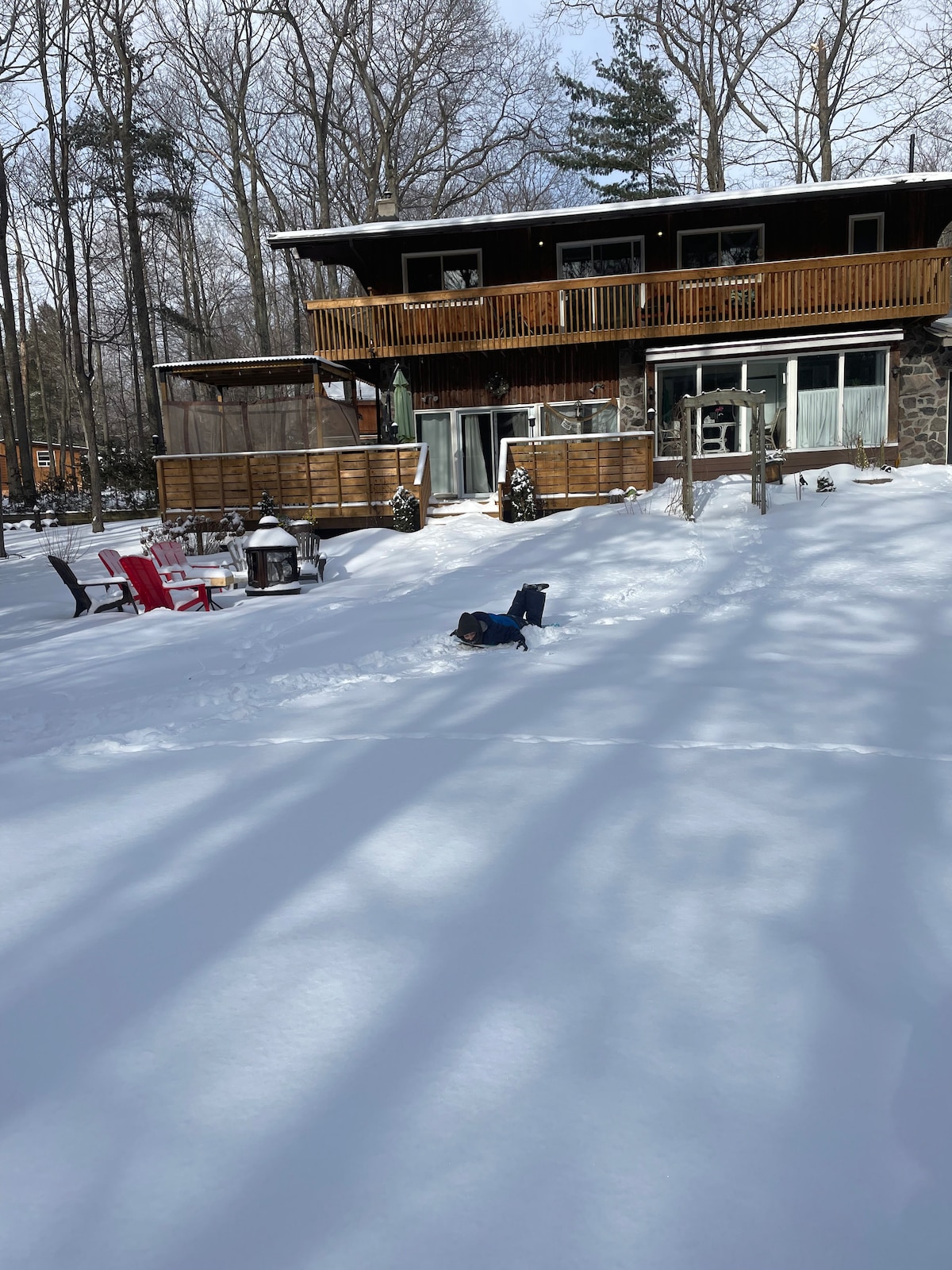 This private mountain retreat is just 15 minutes from Blue Mountain, features 3.2 acres of beautiful scenery, a swimming pool and a renovated home for 10 guests (Max 8 adults). The house sits at the foot of a private 500ft mountain that is yours to explore all year around. Inside, there is a spacious home built for entertainment. Enjoy all-year fun at the property or head out to enjoy the amazing activities nearby. Only 5 minutes to the beach and 15 minutes to the best skiing in Ontario!