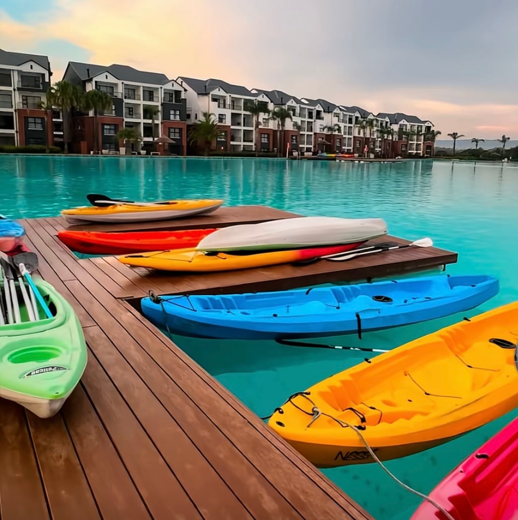 Come as family or friends to a water lovers paradise. There are many other activities as well to keep you entertained. Enjoy the lagoon view from balcony and main in suite bedroom. Apartment has; uncapped and unshaped WiFi smart TV (DStv, Netflix, Disney+) games room board games playgrounds Spa Gym Canoeing Lagoon view Lagoon access Restaurant Car wash