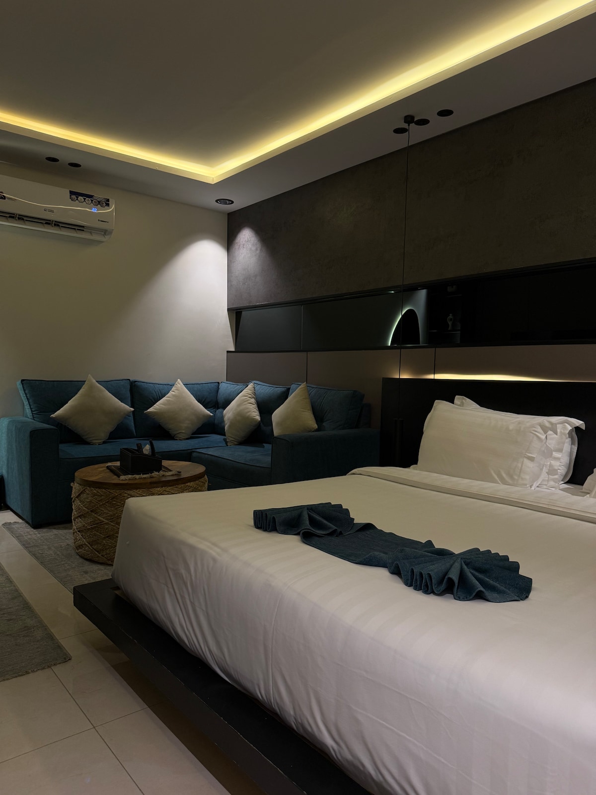 🚨🚙 Free Car Wash with every booking. Reward yourself at Irtahal Apartments, where elegance meets comfort. Enjoy a spacious and cozy lounge with a 65" TV featuring Netflix and more, perfect for those seeking a quiet retreat for studying, working, or leisure. The bedroom provides a relaxing atmosphere with soft lighting. Amenities include an American coffee machine, Turkish coffee maker, kettle, steam iron, mini fridge, and microwave