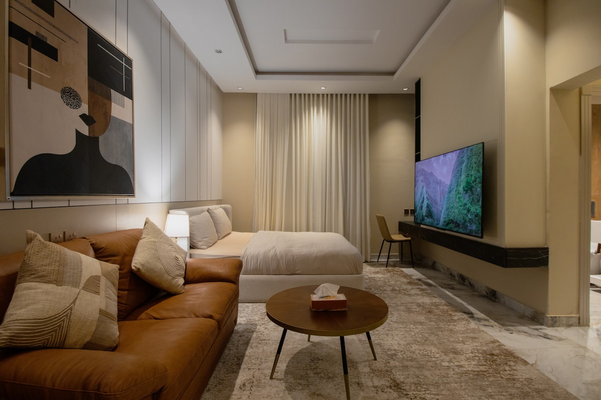 Luxury Apartment with Self-Entry consisting of a bedroom, living room, kitchen, and a fully equipped bathroom (shampoo, slippers, one-time use towels, tissues). • Stunning Boulevard view in Hittin, North Riyadh… The location is ideal, close to major events such as Riyadh Season, Diriyah Season, and all essential services like restaurants and shopping. Specifically: -Boulevard City 1 minute walking -Boulevard World 7 minutes walking -Arena Stadium 8 minutes walking -KAFD 12 minutes driving