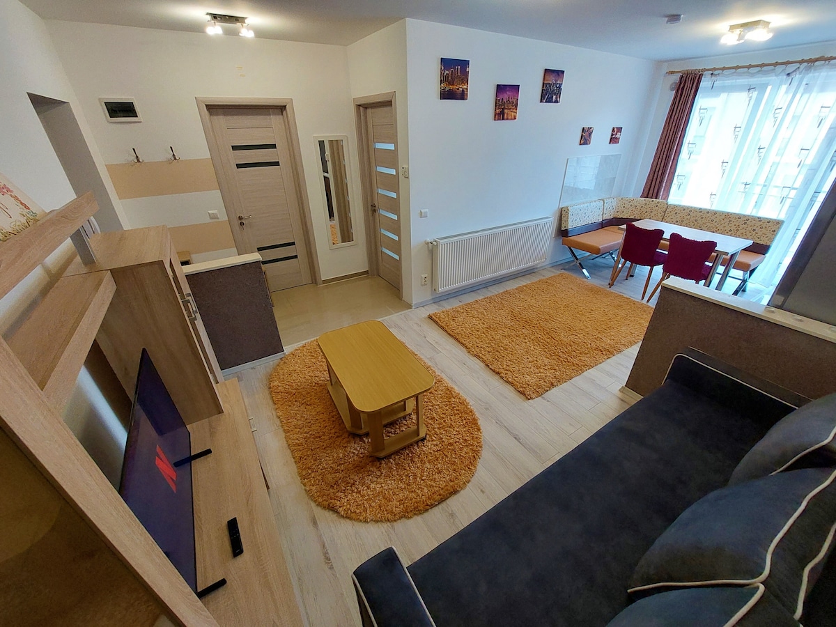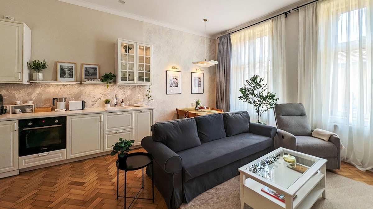 Our apartment is just steps from Piata Mare (Grand Square) in Sibiu. Located in a 200-year-old historic building, it features a cozy bedroom, living area with smart TV (Netflix), fast Wi-Fi, and a fully equipped kitchen with coffee maker, stove, and washing machine. Central heating keeps things warm in winter, and A/C is available during summer. A small private terrace adds extra charm—perfect for relaxing after a day of exploring the city.