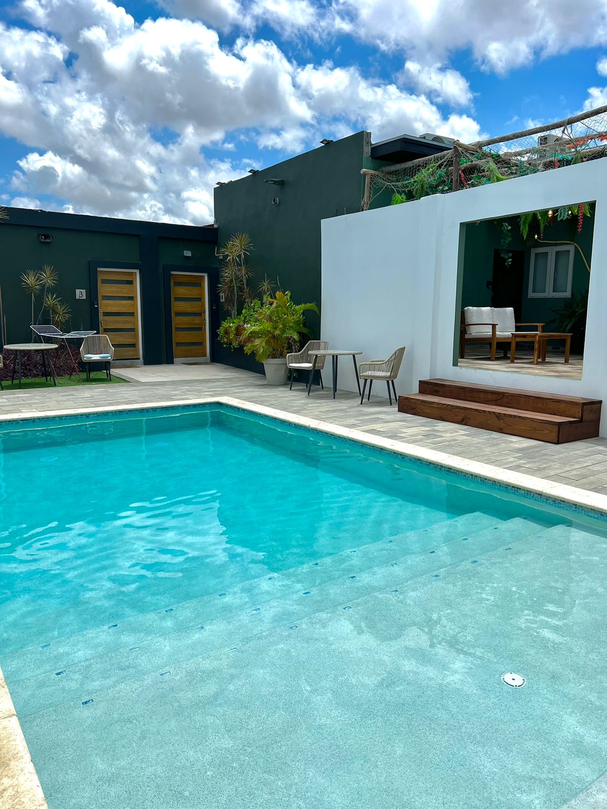 It's a 4 unit apartment complex with a swimming pool/with a shallow lounge area. There is a main door that welcomes all guest on to the property. Every apartment has a dedicated porch which leads to its private entrance. All apartment units have garden and pool view from the living room. There are 3 one-bedroom units and 1 studio apartment. Only 3-5 minutes drive to Eagle Beach and Palm Beach or a 15-20min. walk. You can rent one room or the whole complex to accommodate a big family or a group.
