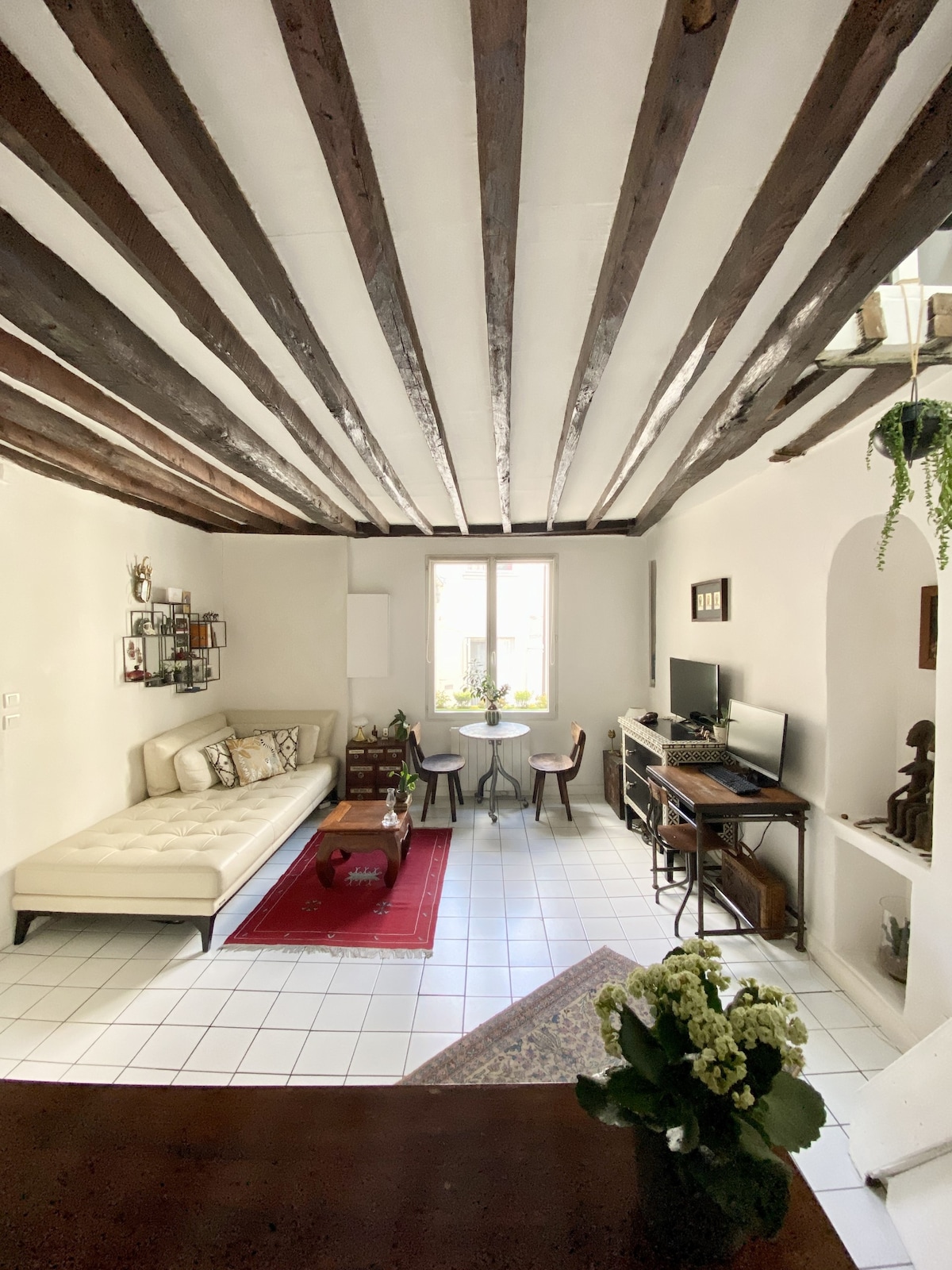 Experience the enchantment of central Paris in our duplex apartment (40m2), offering views of Notre-Dame from the bedroom. This unique space is nestled in a 16th century building in the historic heart of Paris, the Latin Quarter. Situated just 100 meters from Notre-Dame Cathedral, it is the perfect base for couples to explore the city. It offers old world charm with exposed beams and high-end furnishings. Decorative objects brought from all over the world and plants add to the charm.