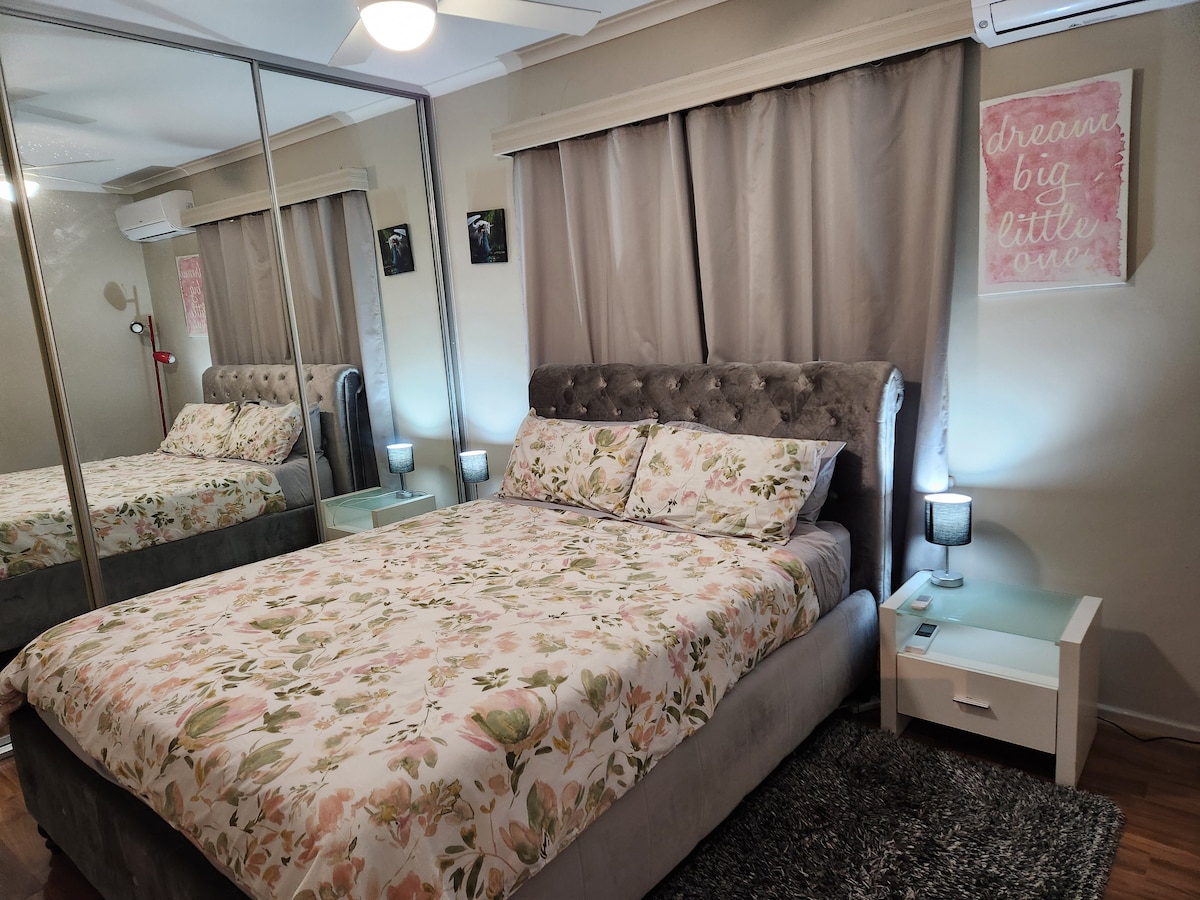 Modern, spacious & air-conditioned home only 3km from CBD. Quiet street within a central & convenient suburb. Dog-friendly (no cats unfortunately). Large grass outdoor space for them to enjoy. Perfect for a group/family getaway or something comfortable for a work trip. Two bedrooms but can accommodate a max. of six guests with inflatable queen-size mattress. Restaurants and takeaways within a few hundred metres, choice of supermarkets nearby, and an easy walk to bus routes for commuting.