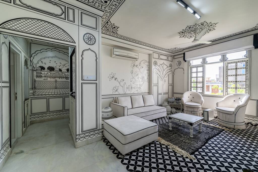 Welcome to The Shri Lalluji Suite — a surreal, hand-painted 1-bedroom stay where you don’t just live in a home, you live inside a sketch. Every wall, arch and frame is designed using traditional Rajasthani miniature fresco work in black-and-white. A perfect escape for couples, design-lovers and slow travellers, this suite blends Jaipur’s royal heritage with intelligent modern comfort.