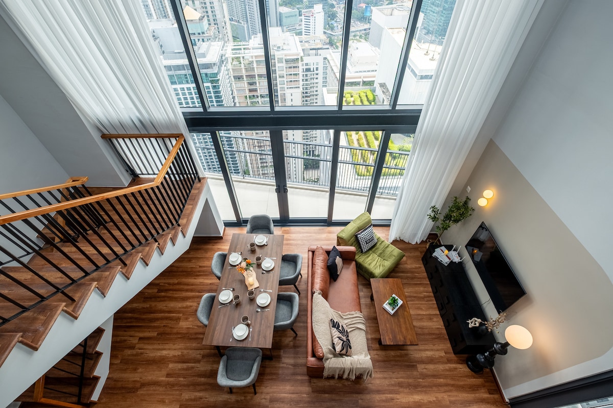 Experience a breathtaking view of KL's skyline from our 2-storey Duplex Loft suite at Bella Homestay. Conveniently located within 5 minutes of Kuala Lumpur's Golden Triangle, our suite offers two king bed bedrooms and a separate living room. We prioritize cleanliness and hygiene with pre-disinfected areas. Enjoy the infinity pool overlooking the iconic KLCC during your stay.