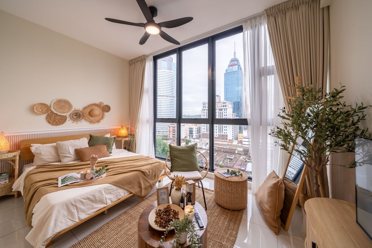Our unit features a cozy vibe with natural textures, rattan, plants, and emphasizing comfort with plush bedding and modern amenities, inviting guests to a "creative escape" or "tranquil oasis" 2 mins walk to Quill city Mall 3 mins walk to Medan Tuanku Monorail station 3 Stations - Bukit Bintang 8 Stations - KL Sentral 7 mins from KLCC 10 mins from Pavilion Bukit Bintang KL 10 mins from KL Sentral (main transport hub) Easy access to Eateries, Marts, Mamak, also your Morning Dose of Coffee
