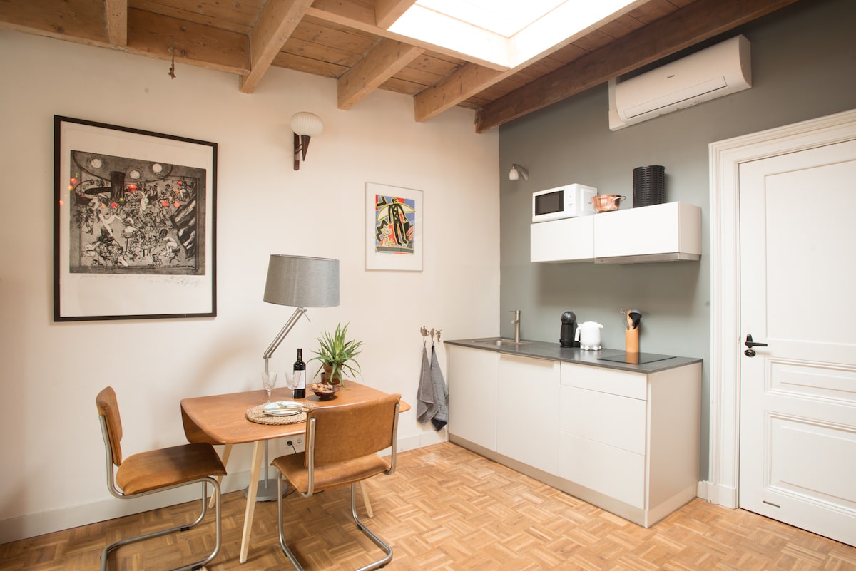 Beautiful loft/studio - ideal for couples and long-term stays. The private light-filled loft (with a kingsized bed) is situated very close to the Weesperzijde, the stunning avenue along the river Amstel, lined with lovely cafes and restaurants, numerous houseboats and offering the city’s best sunset views. You can swim nearby in the clean Amstel. Public transport and grocery shops are just around the corner. It’s truly the best spot in town.