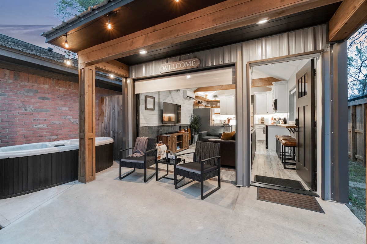 Relax and enjoy the calm serene of a country vibe feel in the middle of the city! This cozy tiny house feels like a gentle hug. Float around the seasonal splash pool, soak in the hot tub, enjoy a small container fire, or sit by the lake and watch the fish. Bring your fishing pole for catch and release stocked pond in this small vintage fishing community. Unit is on the back of the main house. Main house has area on the other side that you can’t see.