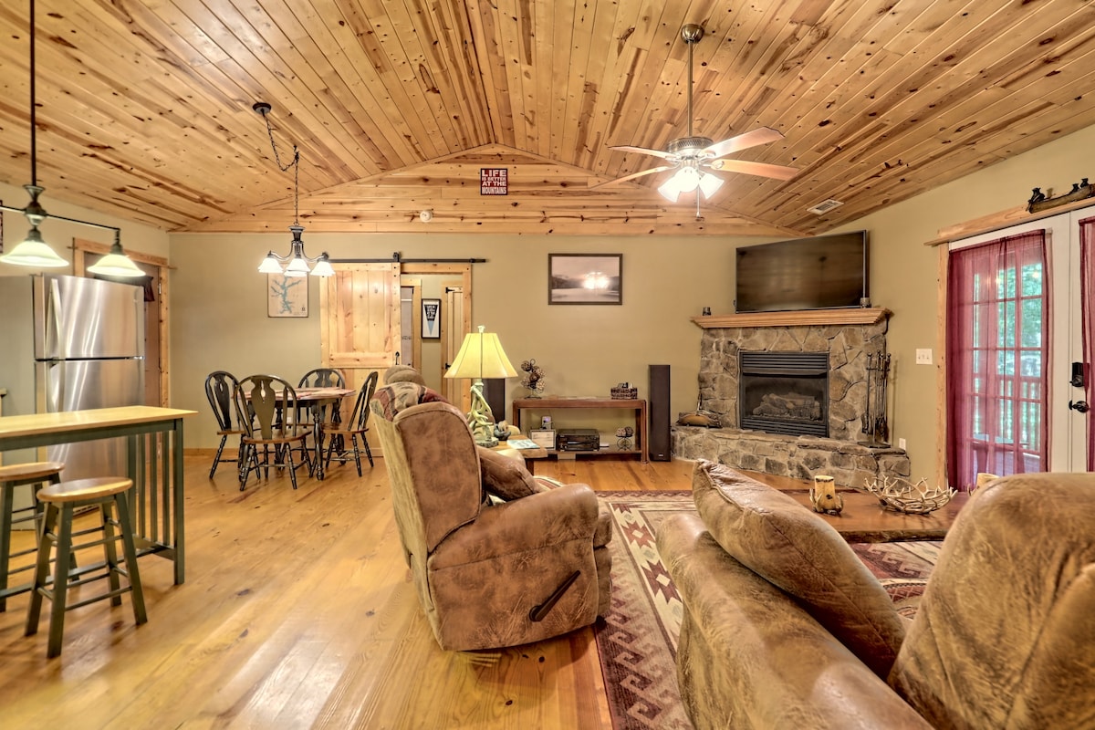 The Couples Cozy Cabin is located 4 miles from downtown Clayton and close to stores, hiking, horseback riding, zip lining, wineries, Tallulah Gorge, Lake Burton and Lake Rabun. Rent a boat 3 miles away at Anchorage Marina on Lake Burton and enjoy the restaurants in Clayton. The space: Clean and spacious. Bedroom 1: Queen Bed Queen Sleeper Sofa Fireplace 2 Smart TVs Free Wifi Central Heating & AC Deck with chairs, covered grilling and seating area. Outdoor Fire Pit $75 nonrefundable pet fee