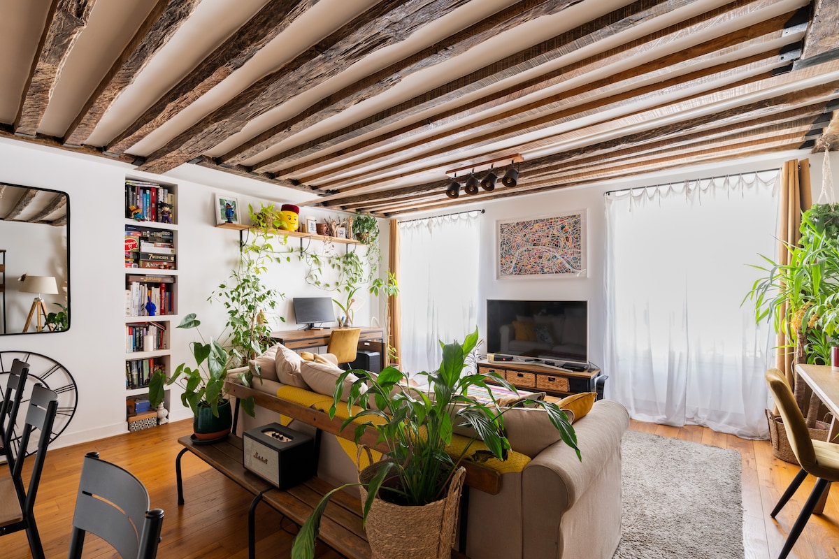 This splendid, bright and well equipped apartment ideal for 2 people is located in the very heart of Paris. You can combine the calm comfort and charm of an authentic eighteenth century "Parisian home" with antique Versailles parquet, ceiling with beams and a beautiful marble bathroom. The apartment has a fully equipped kitchen (fridge, microwave, stove and kitchenware including a kettle and Nespresso machine), a Murphy comfortable 150 bed suitable for 2, Wifi, TV and music system.