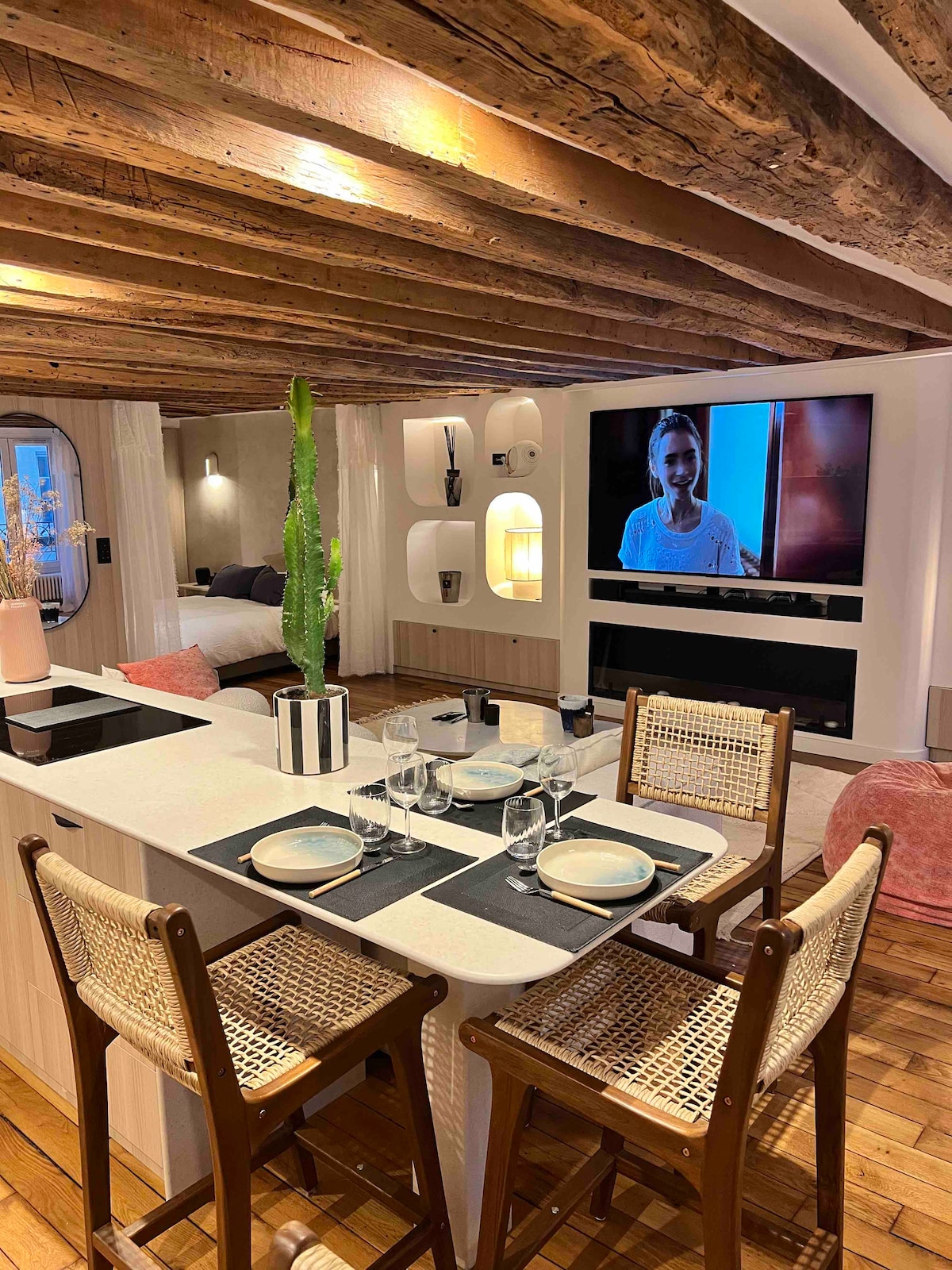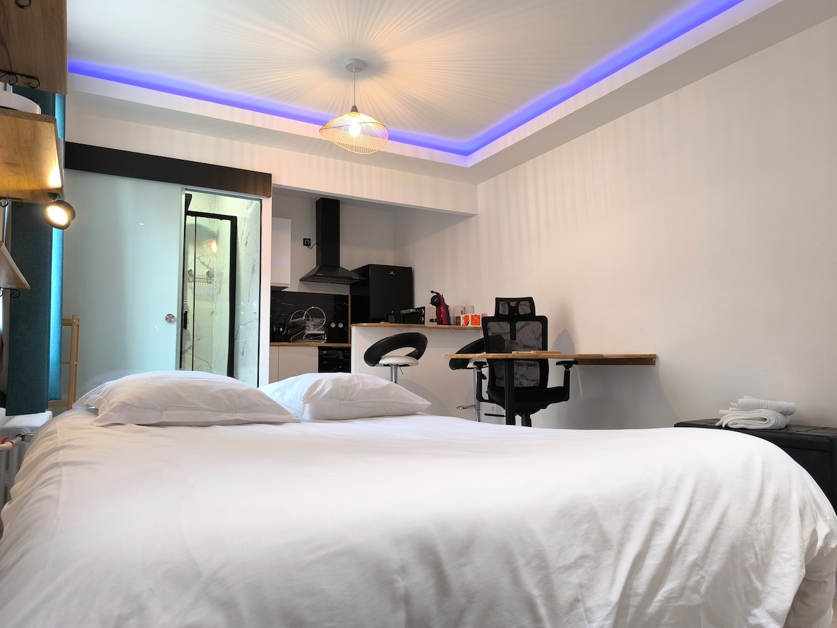 Vivez une expérience unique dans cette luxueuse Love Room parisienne: ・Idéale pour un séjour romantique à deux ・Lit Queen Size (160x200cm), Matelas ultra confortable ・Jacuzzi privé et sauna pour des moments de détente absolue ・Rétroprojecteur pour vos soirées cinéma en amoureux ・Cuisine entièrement équipée ・Lave-linge séchant ・Environnement calme ・Wifi rapide et sécurisée ・Ambiance lumineuse personnalisable 〉Réservez votre escapade romantique dans un cocon de bien-être à deux pas de Paris !