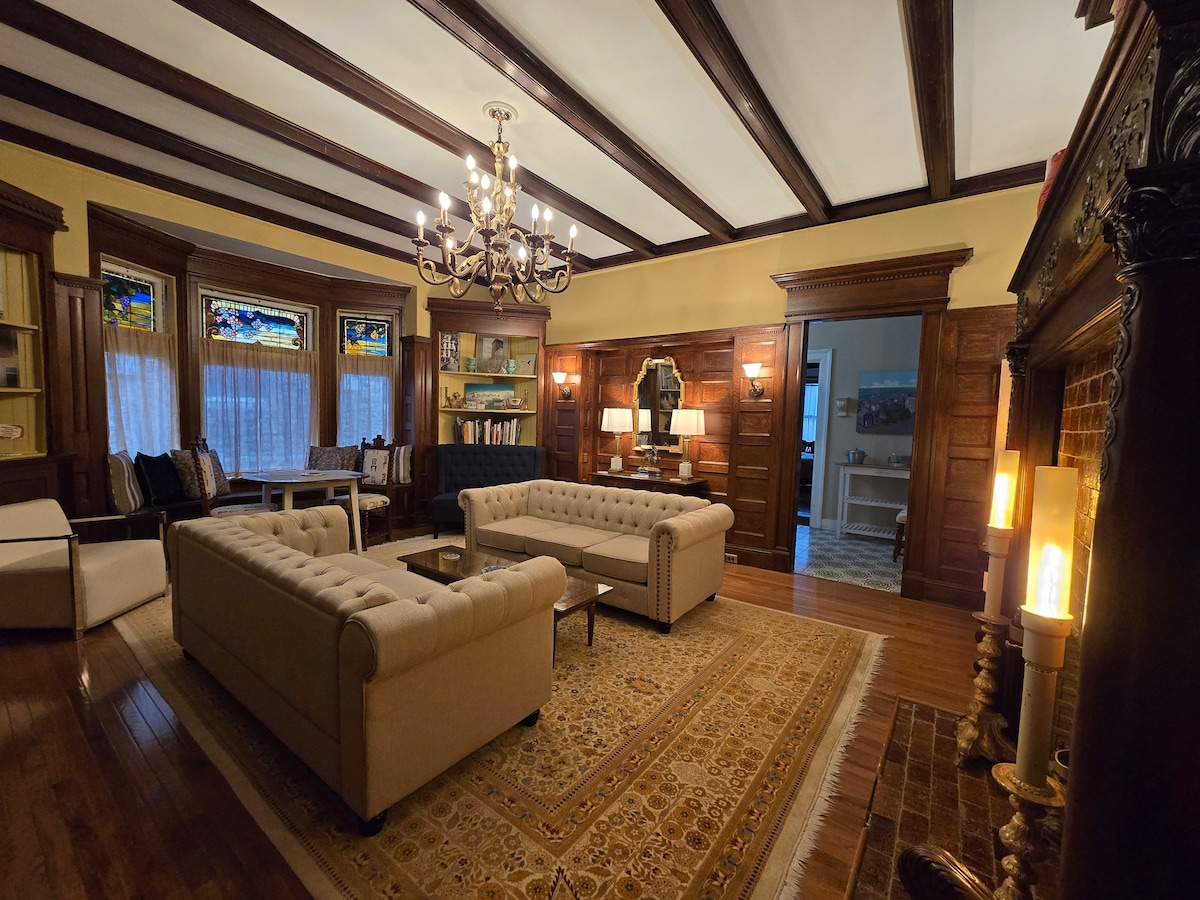 Welcome to the Mansion Suite, a newly renovated historic gem in the heart of Center Square. Through a private entrance, down a long foyer, you'll discover the grand Oak Room, an expansive living/dining room with dramatic fireplace mantel, paneling, beamed ceiling, stained glass windows. Adjacent to the lounge, is a stylish and fully equipped kitchen with new stainless steel appliances. Both bedrooms have new queen beds, beautiful natural woodwork and overlook a private and quiet courtyard.