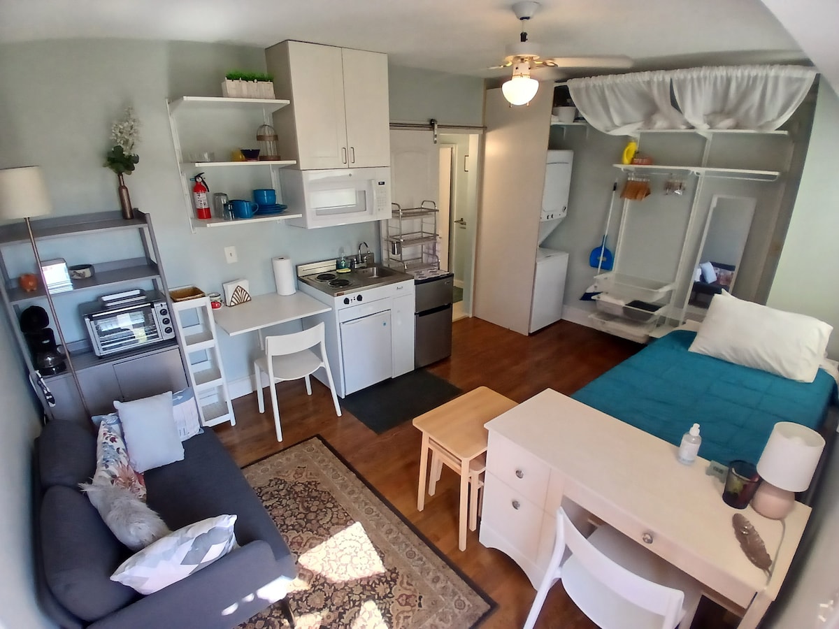 Small, private studio complete with laundry, kitchenette, outdoor space and more! Located in the amenable South Plaza neighborhood, you will be just steps away from the Plaza shopping district, University of Missouri-Kansas City, Whole Foods supermarket, Loose Park, and other attractions. Others, such as the Nelson-Atkins Museum of Art and Union Station are just a few minutes away by car or easily-accessible public transportation.