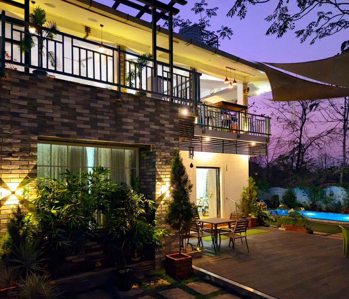 Experience a serene retreat, a picturesque 3-BR 4-Bath farmhouse in Nasrapur, Karjat. This haven, adorned by lush greenery, features a pool, a flowing river & featured in Hotelier India. Crafted with love, the rustic design offers spacious, open areas, inviting a sense of freedom & communion with nature—an ideal escape for a city detox. It stands out for commitment to environmental sustainability. This villa can sleep 15 guests overnight & 30 guests for the day making it ideal for parties.