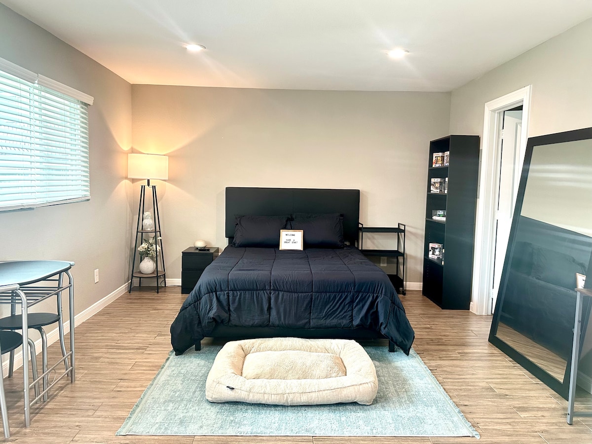 About the Space This property is located right in the heart of the city. Perfect for anyone traveling to Houston. From the park, sport stadiums, the best restaurants and bars in town. Everything you need is just minutes away. The space comes fully furnished with. - HD 55 inch ROKU TV -A comfy queen sized bed -Table for 2 -Fully equipped kitchen with a keurig coffee maker -High speed WI-FI -Coffee pods and Snacks -Your own designated parking spot -Pet bed -Desk We are of course pet friendly!