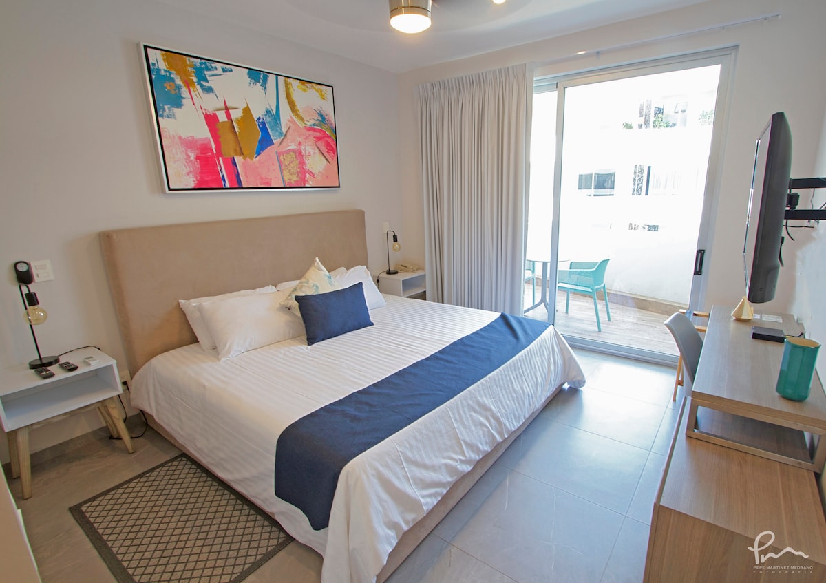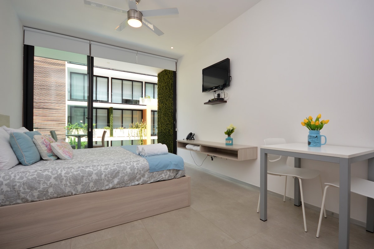 Fully equipped residential studio with queen bed, kitchenette, private bathroom, working desk, and a private terrace ideal for savoring your morning coffee. This studio places you within walking distance of the beach and just two blocks from the vibrant 5th Avenue, where you'll find the most renowned restaurants and supermarkets in Playa del Carmen. This space is designed to offer you the ultimate travel, relaxation, and enjoyment experience in the Riviera Maya.