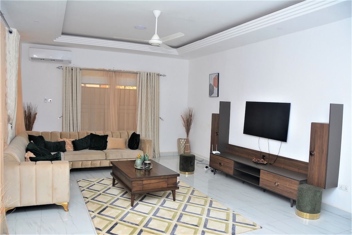 This 4 bed villa has a back-up System which ensures power is available 24/7. It is situated in the popular gated community Paradise Estate of Old Yundum and 12 mins by car from airport or 15 min from major tourist area, beaches & restaurants. It has 2 en-suites with a ceiling fan in every room. Both the master bedroom & living room have air-conditioning units. The neighbourly dining room leads to a fully functional kitchen. Guest(s) booking for at least a week is entitled to week of free WiFi.