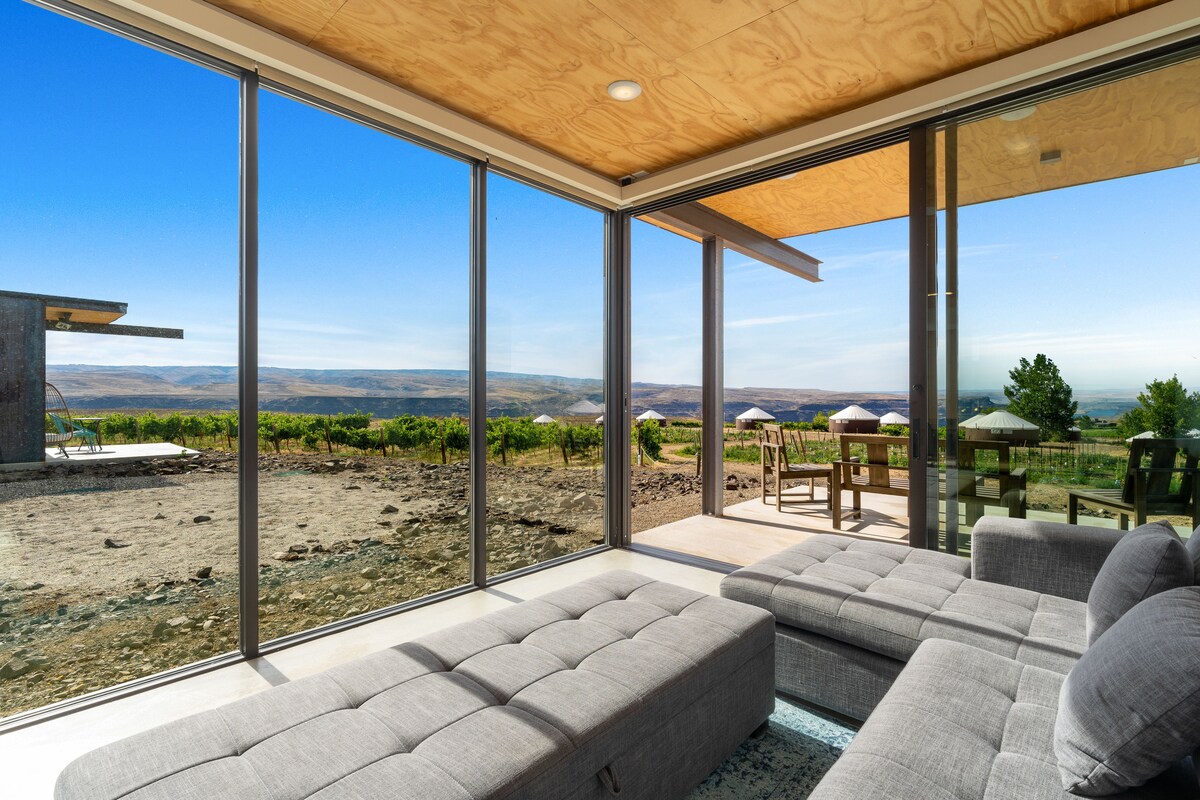 The VIP Lounge is a Olson Kundig-designed home. Steps from the Gorge Amphitheatre, it overlooks the Cave B Estate Winery vineyards & Columbia River. Our 1 bedroom, 1 bathroom home features a private patio and upgraded kitchen. It's a comfortable, modern-industrial feel that fits the landscape. Walk to concerts, wine tasting, dinner, or spa reservations. Hike Frenchman Coulee, bike Ancient Lakes, enjoy yoga on the patio, or just relax and take in the view