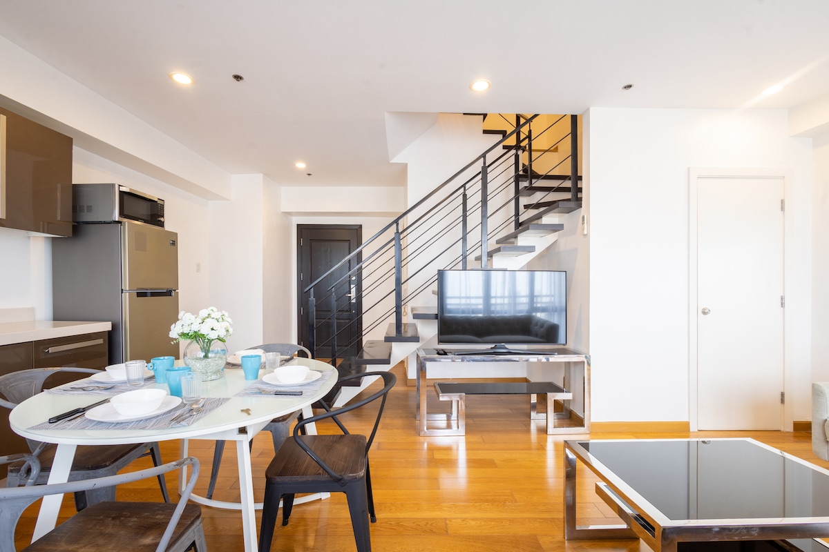 Wonderfully located in the heart of the Makati entertainment district, our 58 sqm 1 bedroom apt offers a spacious living room complete with a 55 inch smart TV and a brand new air con, 1 bedroom and a full Bathroom. The open floor plan combines the living and dining areas and all kitchen access in a single room which can comfortably accommodate 4 guests for dining and socializing.