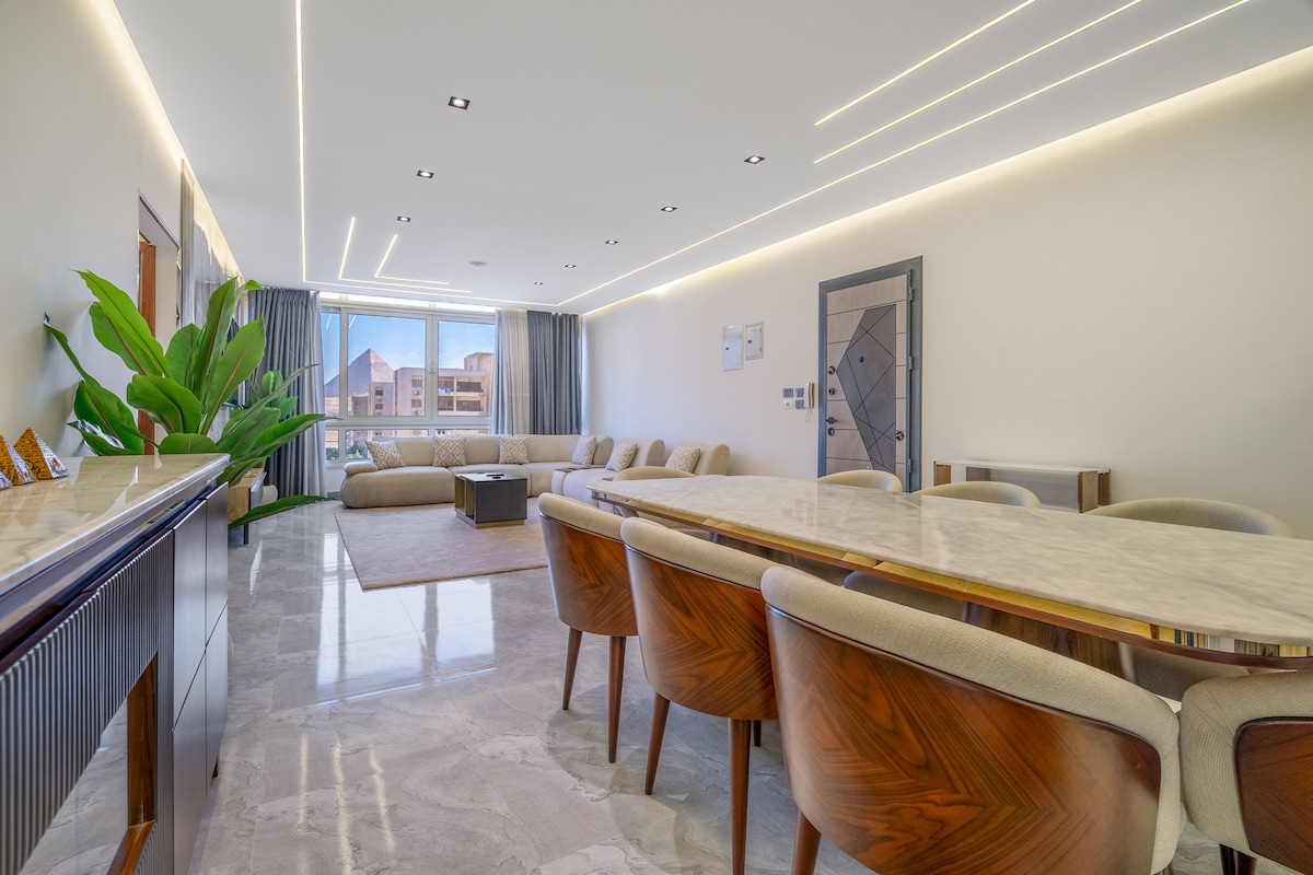 Indulge in a luxurious 3-bedroom, 2-bathroom apartment just a 10-minute walk from the Giza Pyramids and the Grand Egyptian Museum. Unwind in a spacious open-plan living and dining area, cook in a fully equipped kitchen, and enjoy daily housekeeping, Wi-Fi, free parking, Netflix, Nespresso, butler service, and concierge support. Located in a quiet, secure, and central neighborhood for total comfort. Newly furnished — limited-time offer!