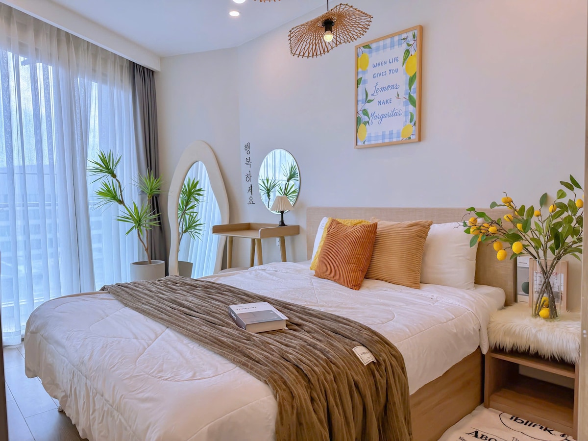 Our apartment has 1 living room, dining space, 1 bedroom (1 double bed and sofa bed), 1 bathroom and the balcony. - The bedroom: Our view from the bedroom is romantic with the view of the grand hill shimmering. We provide air-conditioner, the bed topper, and the bolster. - Kitchen: necessary facilities is provided to cook a delicious meal. - Balcony: spacious balcony with a set of 2 cane-chairs vs 1 table, where guests relax and enjoy the stunning views of the blue sea with a delicious meal.