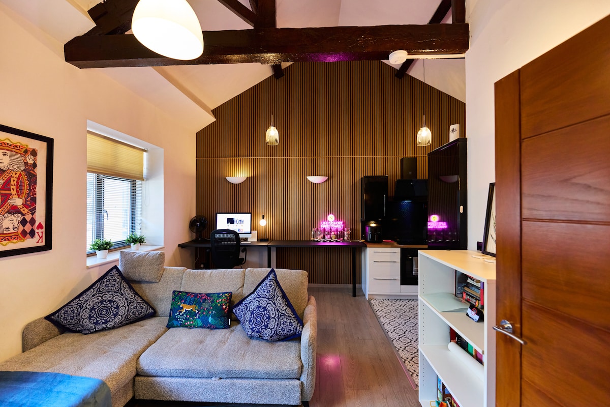 A stylish city-centre loft with exposed beams, luxury tech, and unique touches. Enjoy a 55” Sky Glass TV with full Sky, Netflix & more, a 27” 5K iMac workstation, and a sweet shop for all ages. Sleeps up to 5 with comfy beds, full kitchen, new bathroom, and fast Wi-Fi. Walk to shops, restaurants, and attractions. Car park 30 secs away. Second-floor (stairs only). Self check-in. Vibrant area—light sleepers note urban sounds. Mid-stay check applies to stays over 3 nights.