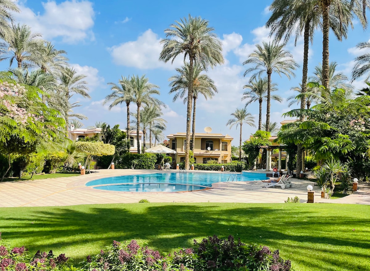 🌟 If you are looking for an accommodation close to the Pyramids and the GEM and to escape the hussle of Cairo City, then this is likely perfect for you. It is serene/silent and relaxing condo with ample of an outdoor space and a large shared pool 🏝️ Located in a secured gated community near New Giza, just 4 km from the Pyramids and Grand Egyptian Museum, and only 30 minutes from Sphinx International Airport. Ideal for travelers seeking inspiration near Giza’s top attractions ✨