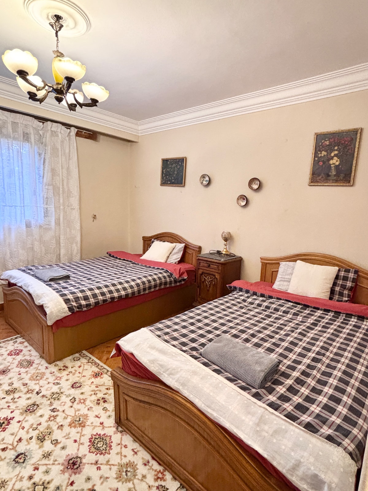 غرفة مريحة تحتوي على سريرين منفصلين داخل شقة بطابع مصري كلاسيكي في قلب وسط البلد بالقاهرة. الغرفة جزء من شقة مكونة من غرفتين، ويشترك الضيوف في استخدام حمّامين، مطبخ متكامل، وليفينج روم واسعة المكان هادئ ومناسب سواء كنت للعمل او السياحة، وقريب من المتحف المصري، ميدان التحرير، والمقاهي والمطاعم التاريخية، لتجربة إقامة أصيلة ومريحة في قلب القاهرة.