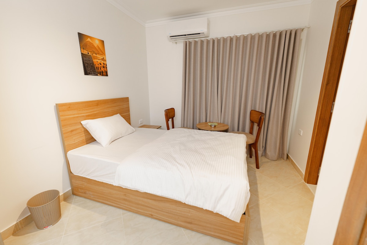 Large double room with a private balcony facing the Pyramids (4th floor). The room includes AC, a TV, fridge, kettle, as well as complimentary coffee, tea, and water (free iron upon request). The bathroom includes towels, a hair dryer, and complimentary shampoo, soap, and shower gel. The price includes homemade Egyptian breakfast prepared daily and served on the rooftop from 8 to 10 a.m