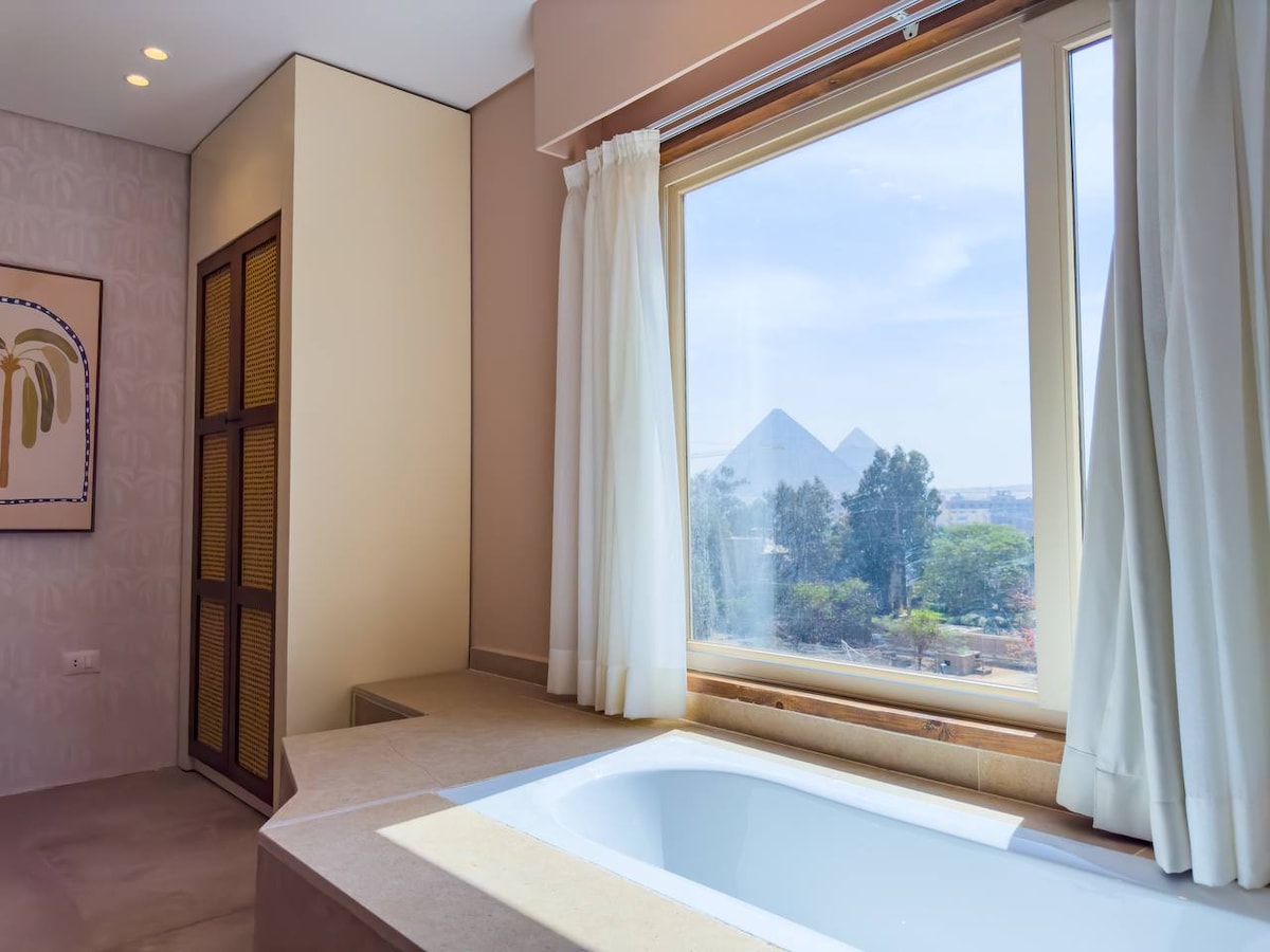 The Khan of the Pyramids, one-of-a-kind retreat where handcrafted design meets ancient wonder. This serene apt is nestled in El Haram and offers a direct view of the Pyramids from your bed or Hot tub Every corner is filled with earthy textures, curated pieces, and natural light — designed for slow living, restful nights, and magical mornings with a view that’s truly unforgettable. Whether you’re a couple, solo traveler, or creative soul seeking inspiration, this Khan is your haven in Giza..