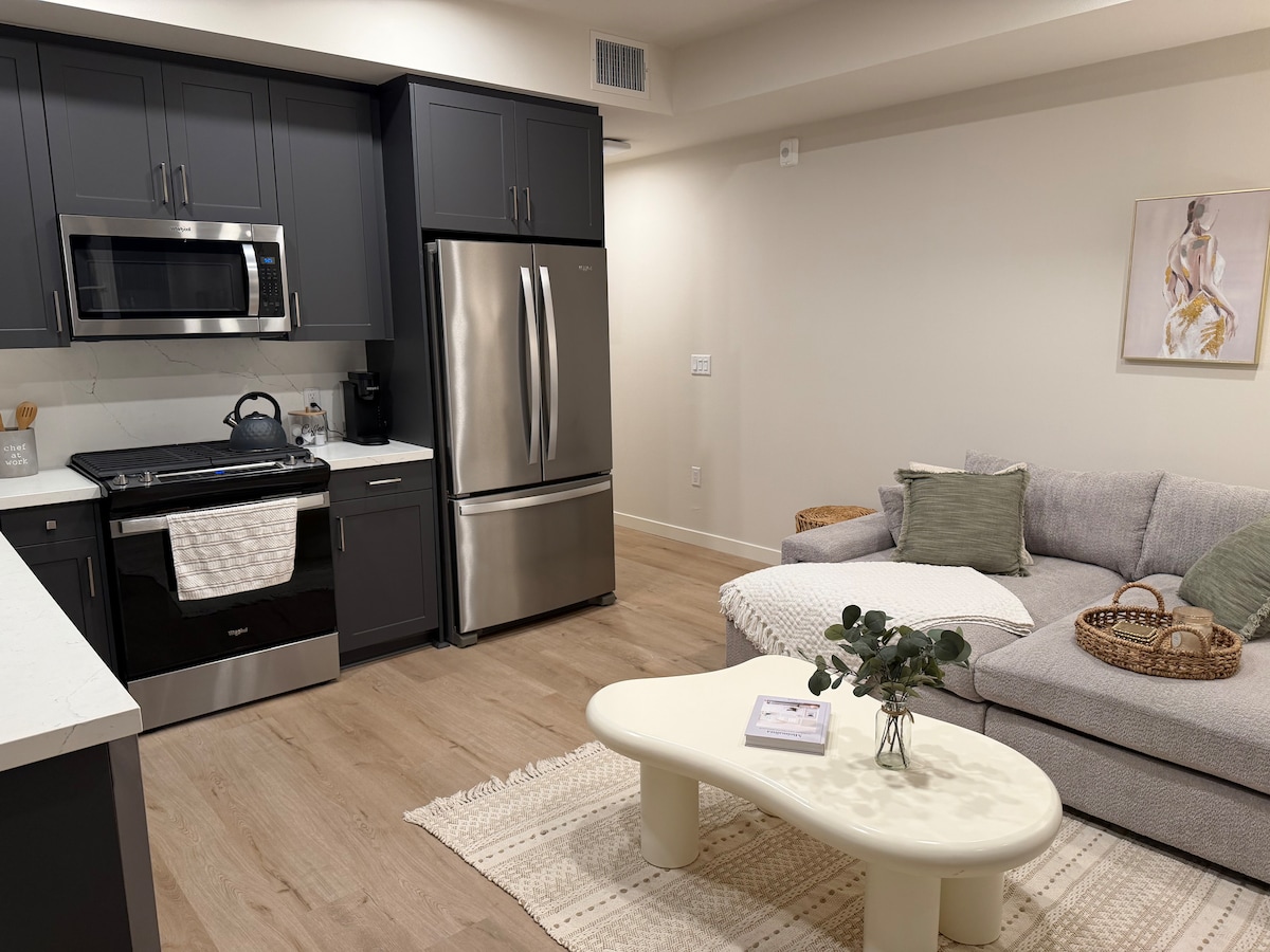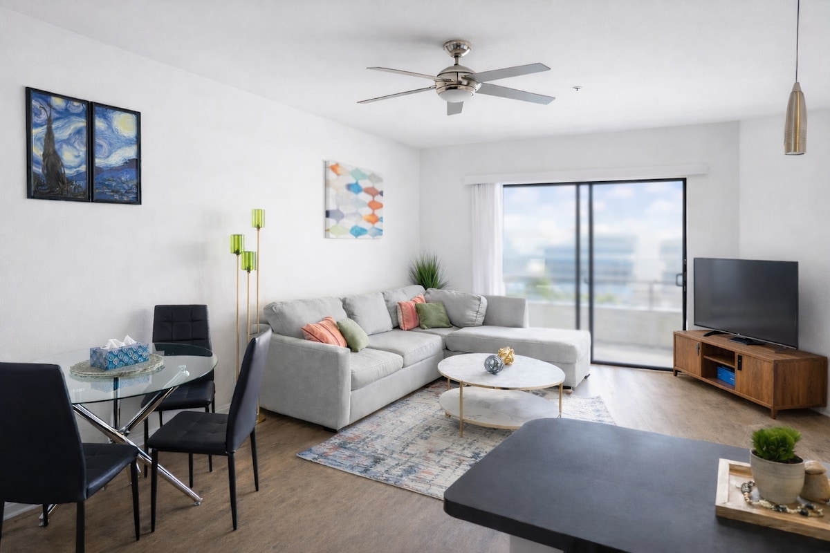 New Boho style studio with private balcony! -Gym. -Resort style outdoors plunge pool with Jacuzzi. -Free Gated garage reserved parking. -In unit washer and dryer. (Detergent included). Brand new King size MEMORY FOAM BED & stylish sofa! Spacious bathtub with essentials. 55’ smart TV with free Netflix. Fully equipped brand new kitchen with dishwasher. PROFESSIONALLY DEEP CLEANED & SANITIZED BEFORE EACH CHECK IN!