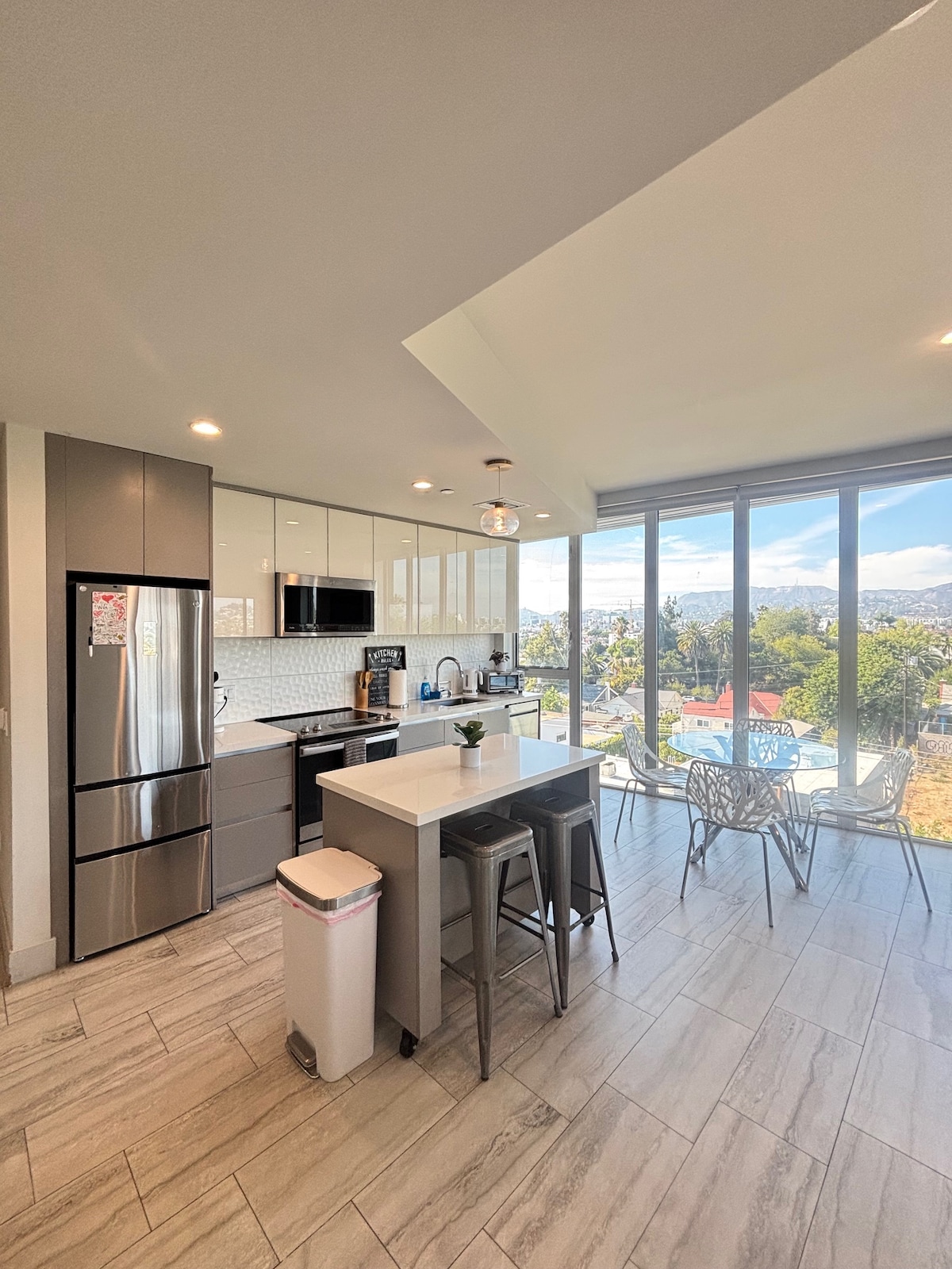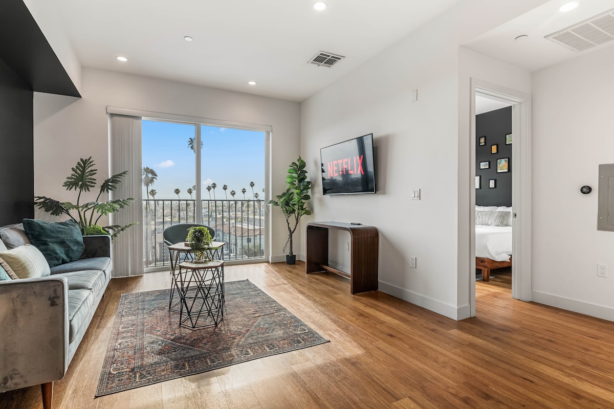 This luxurious apartment is located in West Hollywood, near Melrose District. It is perfect for short-term and long-term stays. It offers a comfortable floor plan, a luxurious sofa, a kitchen bar, a fully equipped kitchen, a queen size bed and a walk in closet. The apartment building offers access to a fitness gym, a pool, outside grilling stations and more.