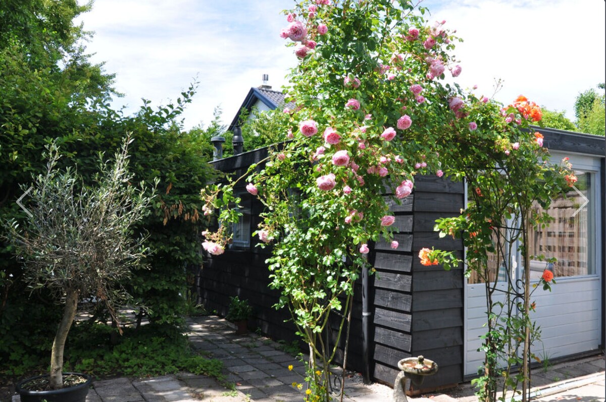 The 40m2 guesthouse is located in recreation area "Spaarnwoude", (3 persons in the house and we can host 2 extra persons (kids) in a caravan) included season shared pool and with a all year around outside hottub close to the beach of IJmuiden/Zandvoort and train-busstation Amsterdam Sloterdijk (15min). Activities nearby: SnowPlanet, a golfcourse, horse riding, harbour and water activities. Bus 382 stops nearby. Ruigoord is close. Beautiful Bali-style design. We have an outdoor trampoline.