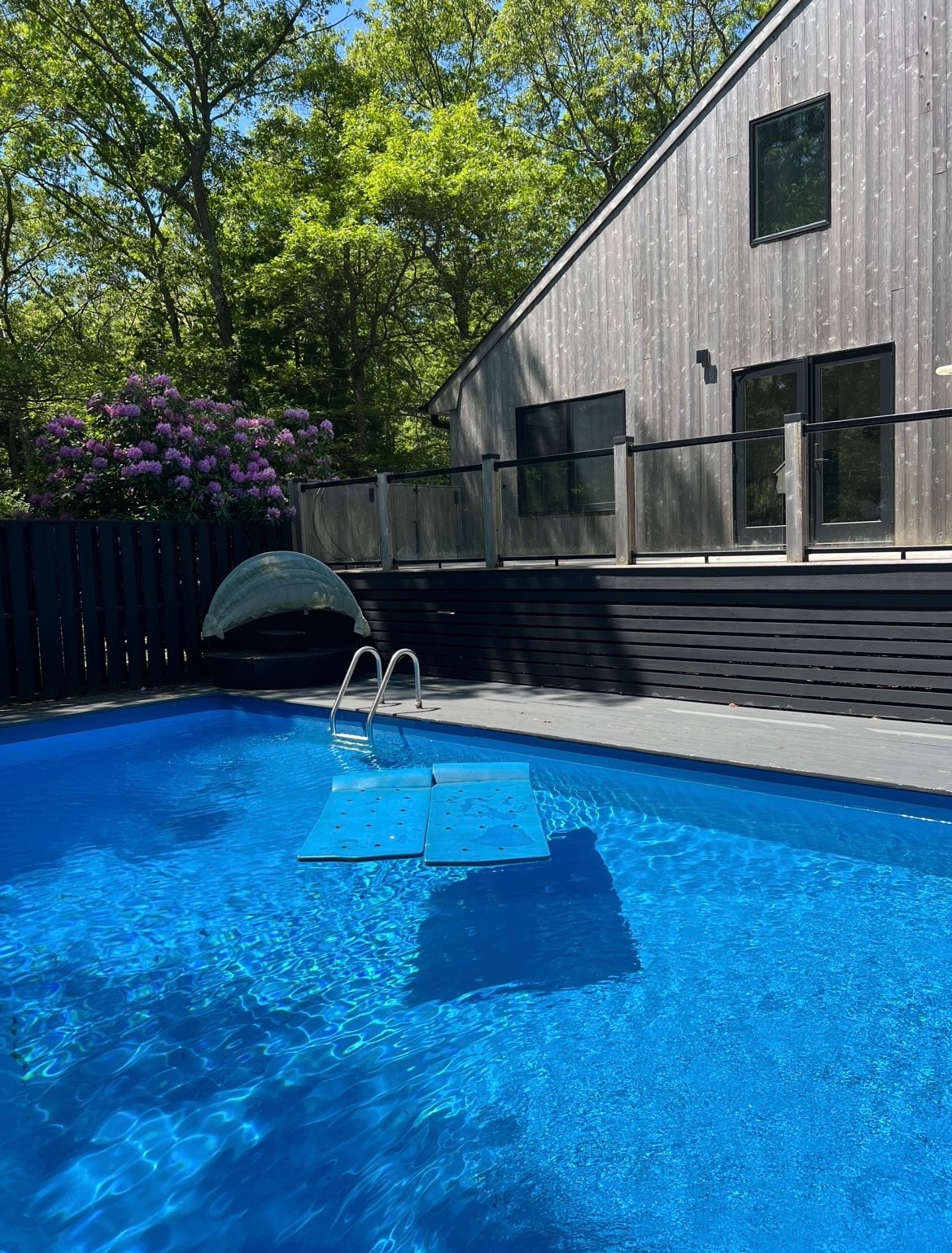 A beautifully landscaped tranquil oasis. Newly constructed private two bedroom, one bathroom guest extension to owner occupied house. Guests share large yard and pool with owner, and have private deck and seating area. Private entry and parking. Guest's may enjoy outdoor shower and BBQ. Please note there is no kitchen, however a small fridge, Keurig coffeemaker and microwave, plates/utensils are provided. Conveniently located to beaches, shopping and local restaurants in East Hampton.