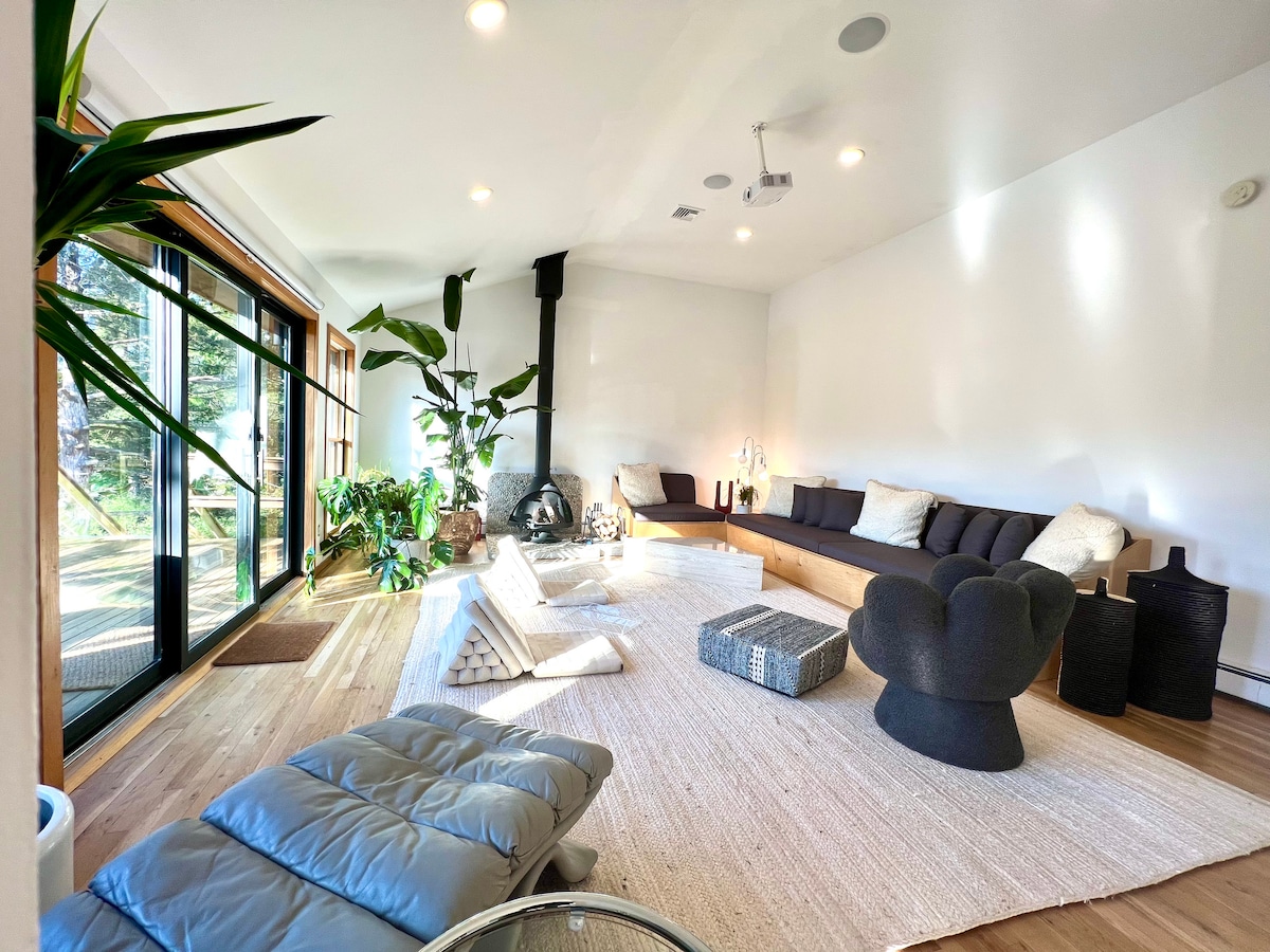 Where design meets relaxation. A rolling acre just steps from idyllic Hay Beach, Moonlit Manor offers peace, style, and whimsy. Watch songbirds and deer through the picture window, catch a film in the jungle-inspired home theater, or cook in the Jetsons-worthy kitchen. Three bedrooms, a cozy study, private office and a fitness room with Tonal keep comfort and creativity in balance. Outside, garden paths lead to a barrel sauna for four: your private retreat for cool evenings under the stars.