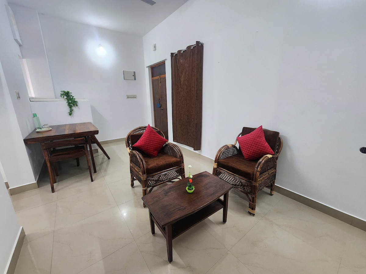 This flat is fully private, no sharing of any area and it is couple friendly. This place is for 2 to 4 guests. We need ID proof of all guests. The place has 1 bedroom, one hall, kitchen and one bathroom with some outdoor space. The property is at ground floor and the flat has king size bed, AC, Android TV with Apps, Oven, Geyser, iron, Sofa-cum-bed with AC in hall, Dining table, RO Water purifier, Refrigerator, Gas stove, mixer grinder, pressure cooker and other all the other kitchen utensils.
