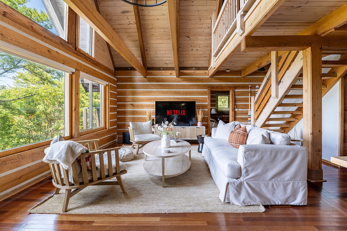 Tucked in the heart of Muskoka, this handcrafted timber frame cabin rests alongside a scenic spring-fed lake, surrounded by 8 acres of private forest. Only 10 minutes from Bracebridge, enjoy serene lake life and natural beauty while remaining close to town amenities, local shops, and eateries. Enjoy private dock relaxation, cozy cabin comforts, and outdoor fires. A Provincial Park Day Pass is included (*security deposit required) for added adventure. Come relax, recharge and reconnect.